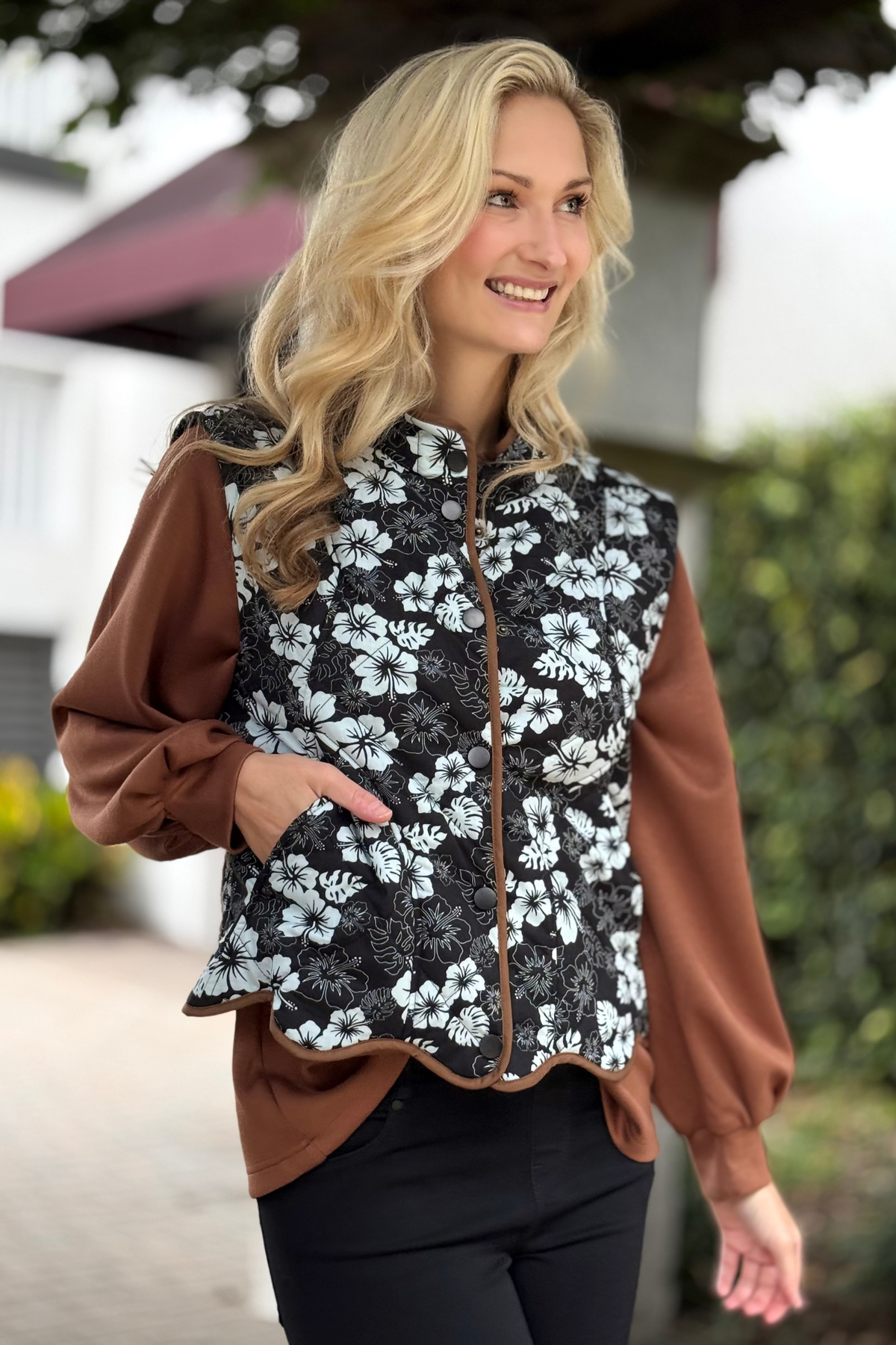 Add a touch of charm and texture to your fall layers with The Meadowlane Quilted Vest. This button-down vest features a floral quilted design that perfectly blends cozy and chic. The scalloped hem and solid contrast binding give it a refined finish, while the mock neckline keeps you warm and polished on cool days. Style it over your favorite long sleeve or turtleneck for a look that transitions effortlessly from casual weekends to lunch dates.