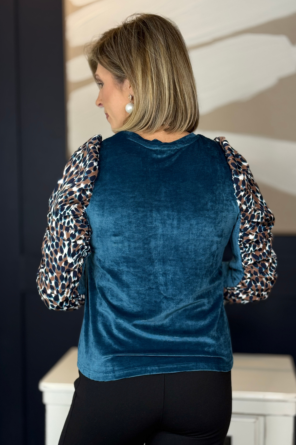 Elevate your everyday style with the Wild Luxe Chenille Leopard Sleeve Top, a perfect blend of cozy texture and bold design. This standout top features a rich chenille body in a deep teal hue, offering a soft, luxe feel with effortless drape. The contrast leopard print sleeves add a fashion-forward edge, creating a striking balance between classic comfort and modern flair. Designed to be easy yet elevated, this top pairs beautifully with denim, white bottoms, or tailored pants for work-to-weekend versatility. A must-have statement piece for the woman who loves comfort with a touch of wild style.