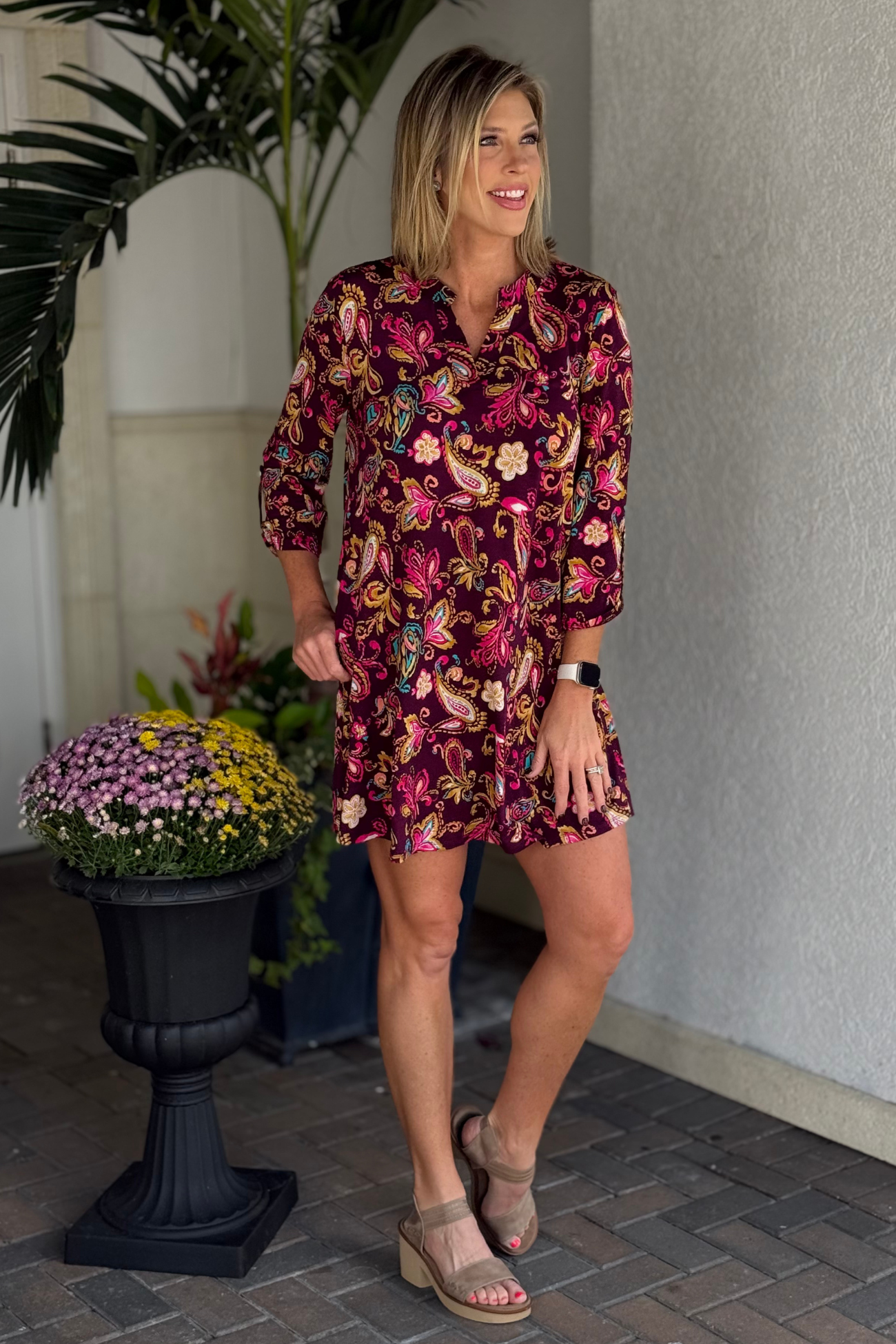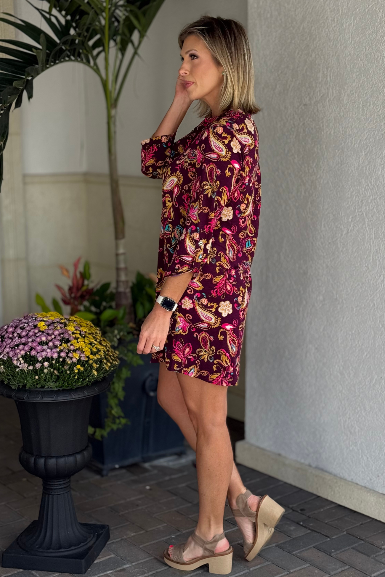 Wrinkle-free and travel-ready, the TPN Merlot Paisley Lizzy Pocket Dress is your new go-to for chic, effortless style. Crafted from Dear Scarlett’s signature lightweight poly blend, this dress keeps you cool, polished, and carefree all day. The rich merlot background with a vibrant paisley print pairs beautifully with boots or wedges. A flattering Lizzy neckline, easy A-line silhouette, and hidden side pockets complete this classic boutique favorite.