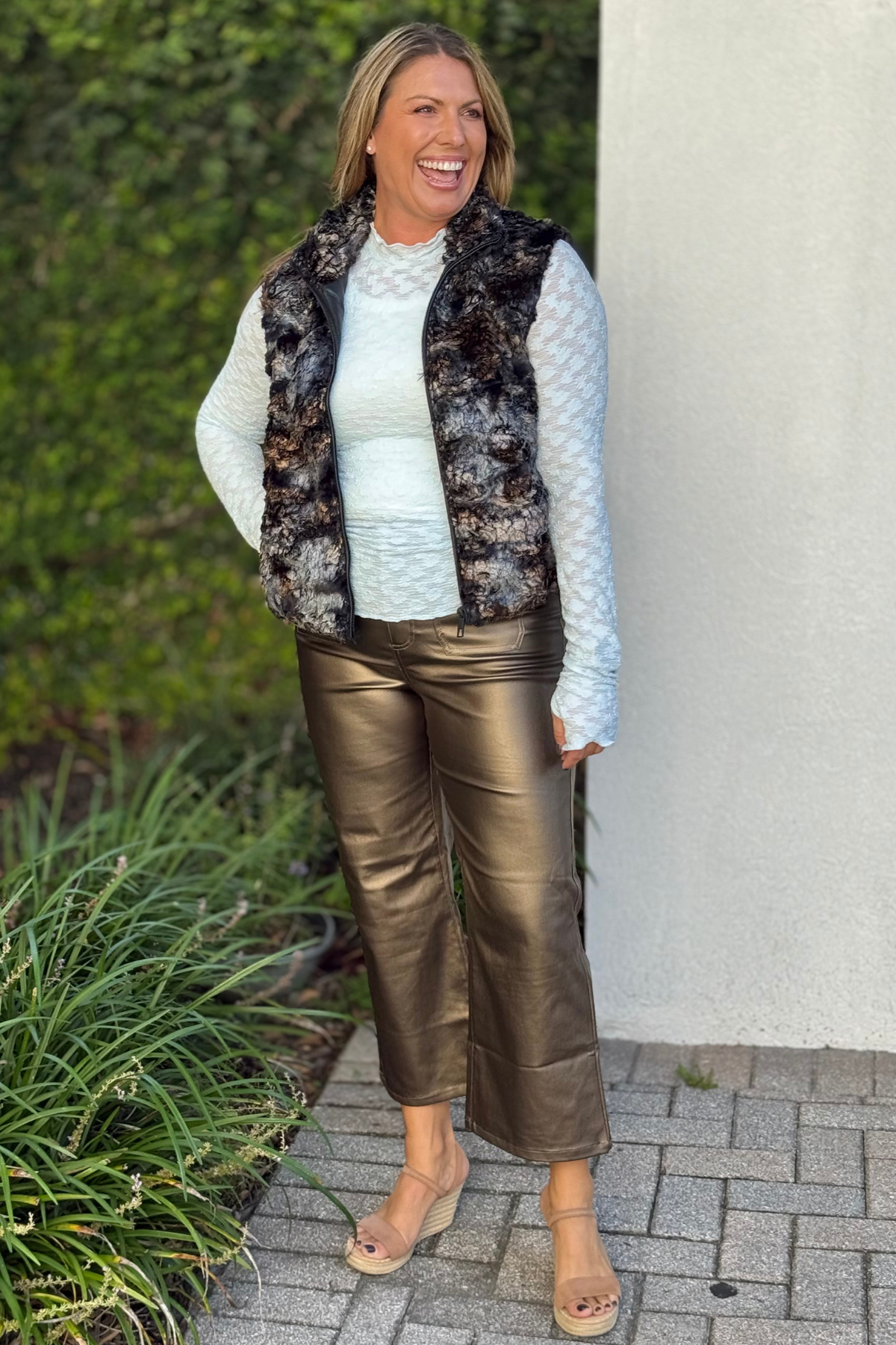 Wrap yourself in cozy sophistication with the Renuar Luxe Faux Fur Vest in a stunning bronze mix. The ultra-soft vegan faux fur showcases a beautiful blend of rich, dimensional colors that instantly elevate any outfit. Designed with a zip front and functional pockets, this vest is as practical as it is stylish. Layer it over a sweater and tailored pants for a polished look or pair it with jeans for effortless weekend chic.