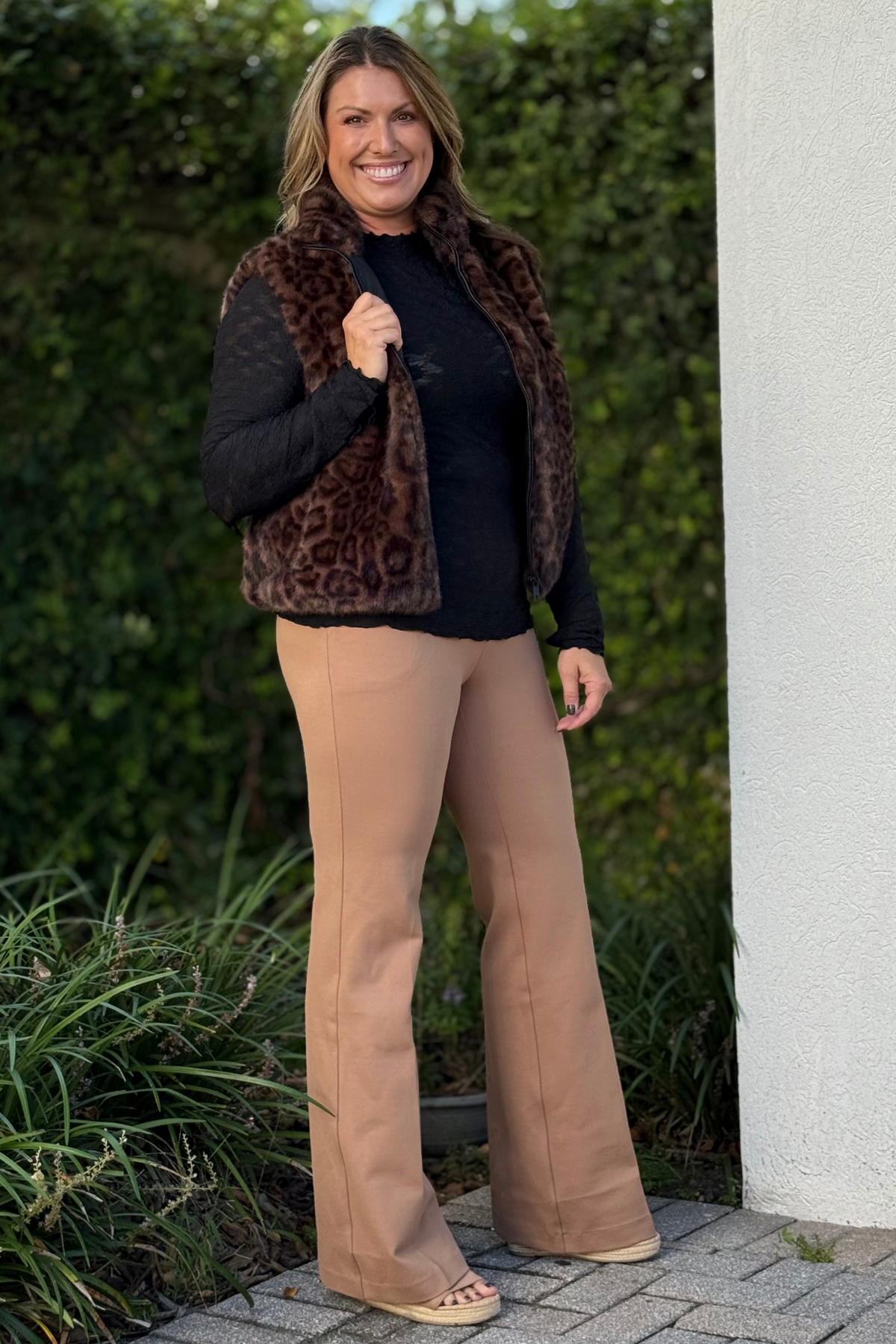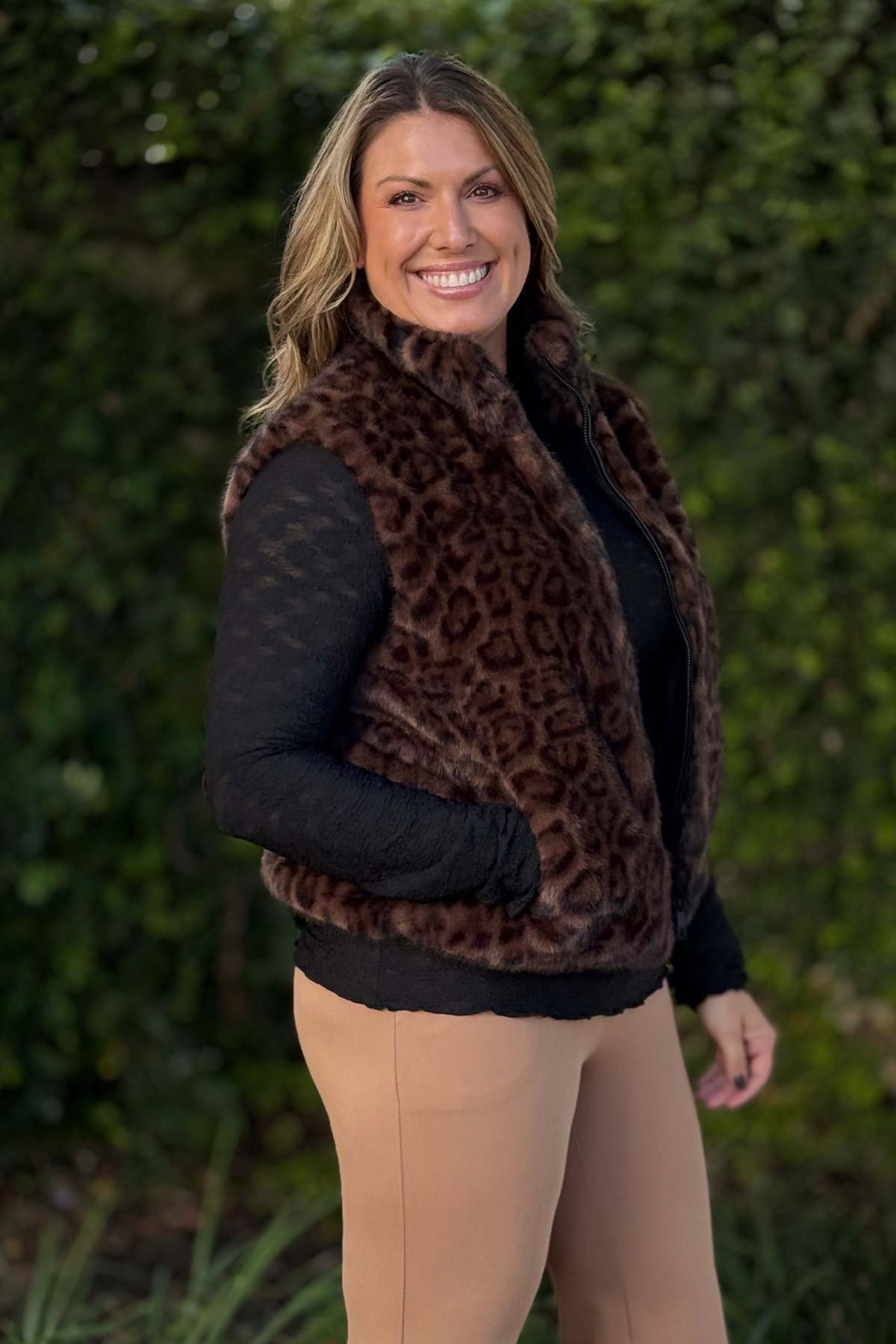 Embrace the cozy-chic vibe of Fall 2025 with the Renuar Vegan Leopard Vest in Chestnut. Crafted from plush faux fur in a rich chestnut hue, this vest features a bold leopard print that adds a touch of luxe to any outfit. The mock neck and sleek zip-front closure create a polished silhouette, while the satin-finished inner lining keeps it smooth and comfortable. Effortlessly stylish, it pairs beautifully with black pants or your favorite denim for a look that’s both warm and fashion-forward.