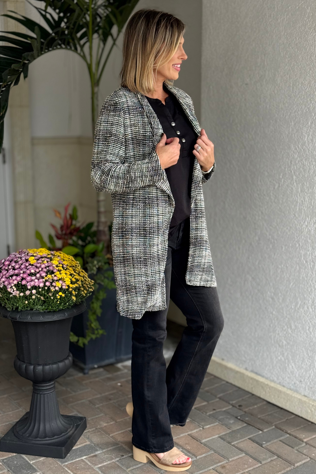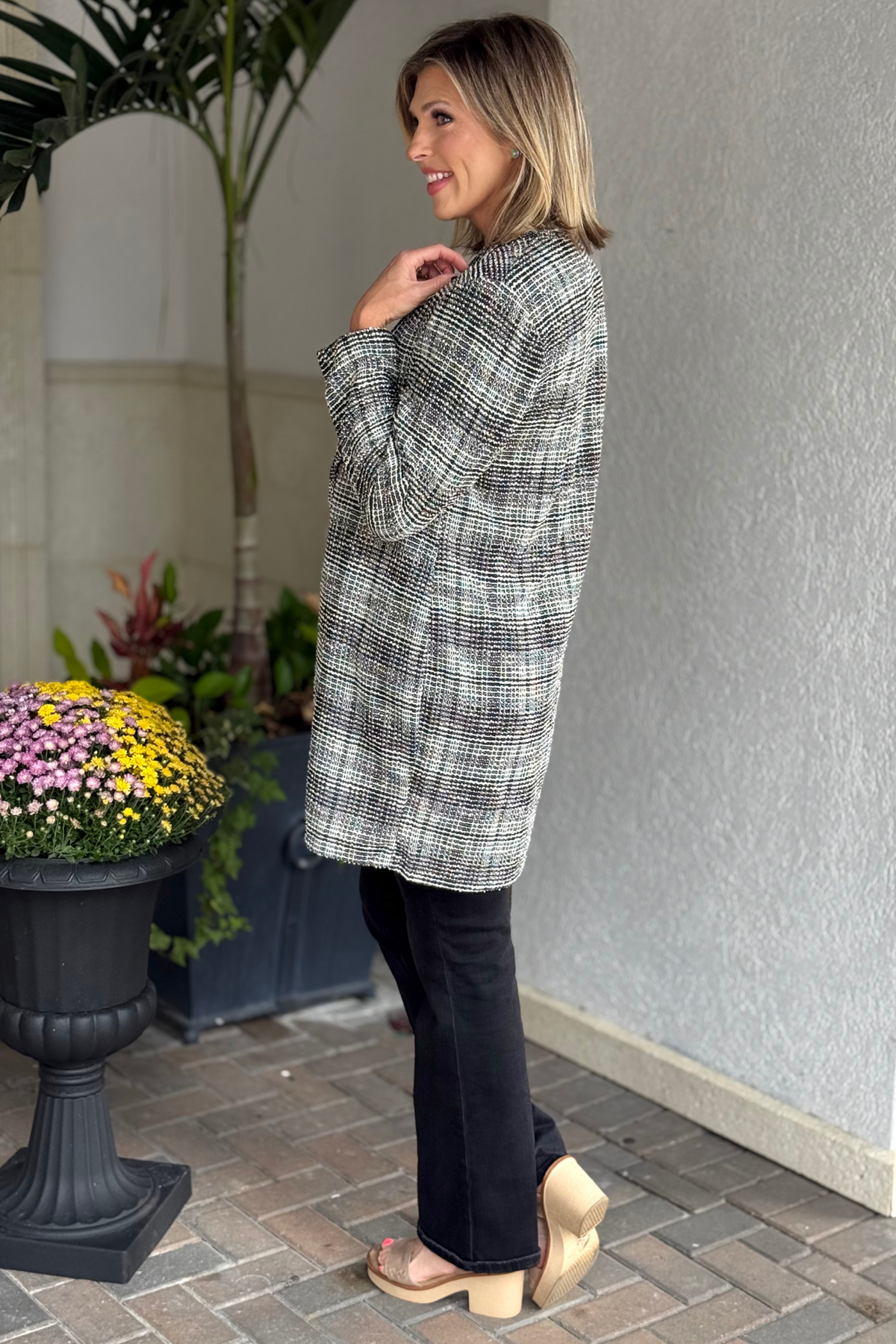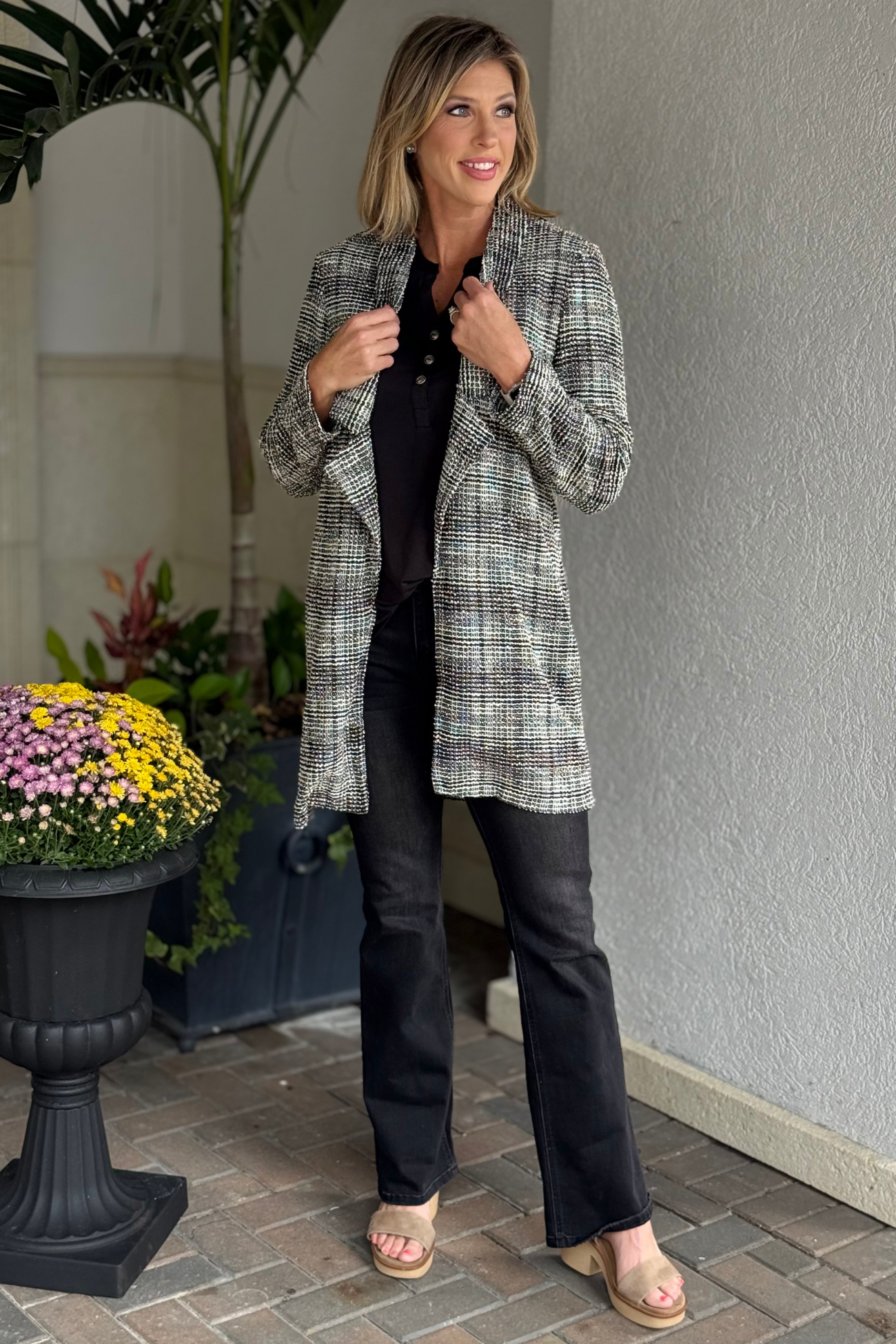 Elevate your wardrobe with the TPN Brixton Tweed Midi Blazer—a chic open-front layer that blends timeless sophistication with modern flair. Crafted from textured tweed fabric with a touch of stretch, this mid-length blazer offers a classic silhouette and effortless comfort. Perfect for workdays, weekend outings, or polished evening looks.