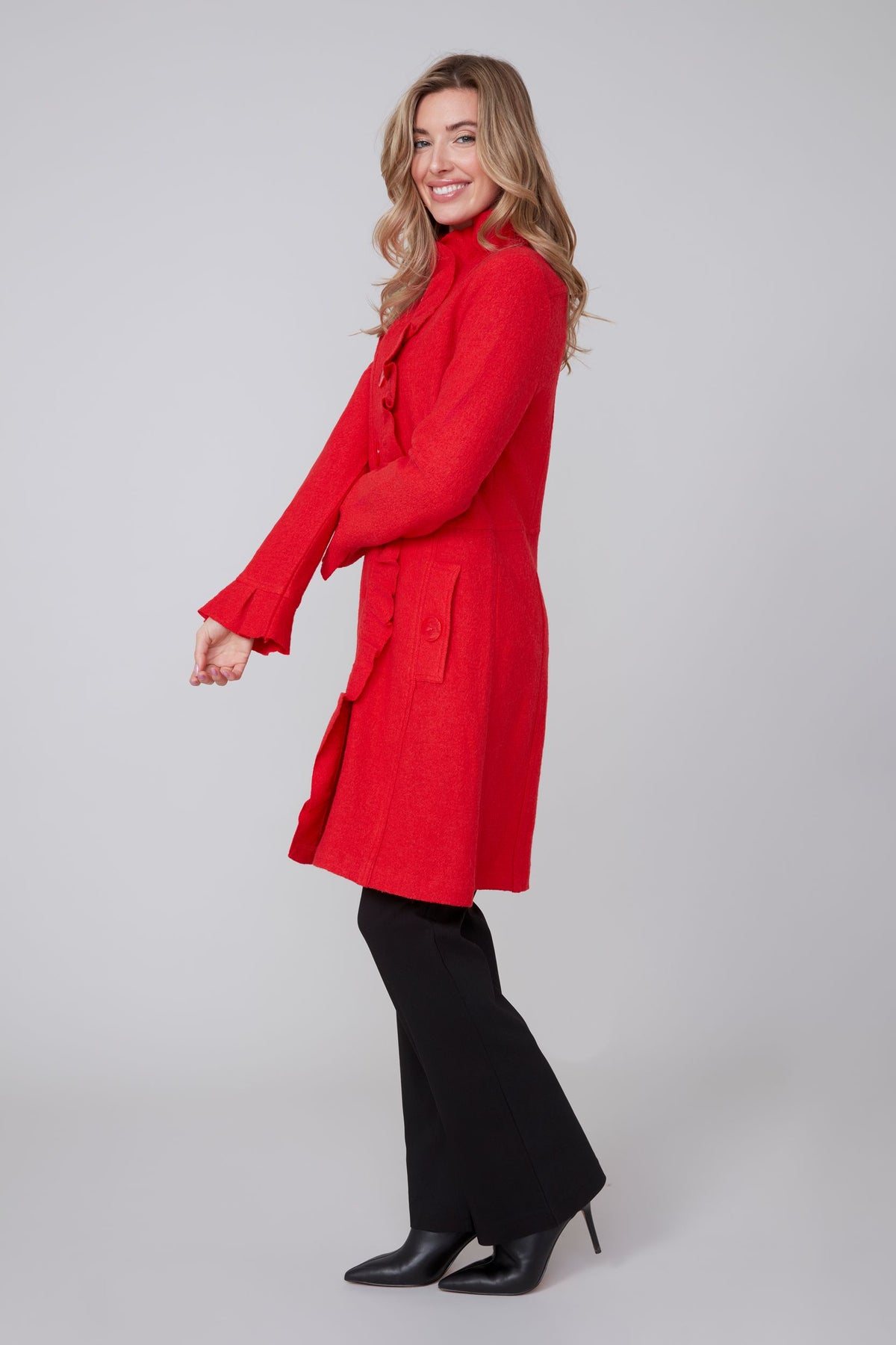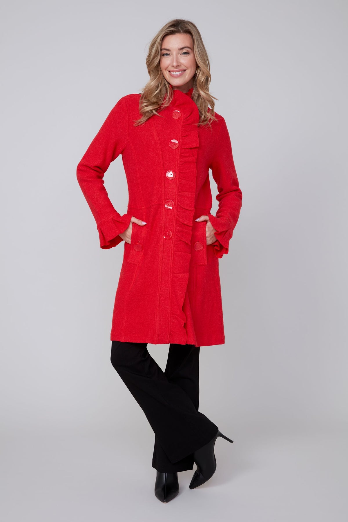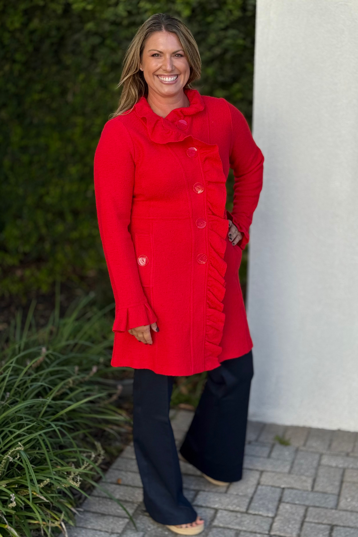 Effortlessly elegant and delightfully lightweight, the Renuar Scarlet Ruffle Button Jacket brings a polished finish to any outfit. Tailored in a vibrant scarlet hue, this statement piece showcases a cascading ruffle placket, refined button closure, and subtle flounce at the cuffs for a touch of feminine charm. Crafted with Renuar’s signature attention to quality and comfort, it’s the perfect jacket for layering over workwear, evening looks, or weekend denim. For a flawless fit when layering, consider sizing up if between sizes.