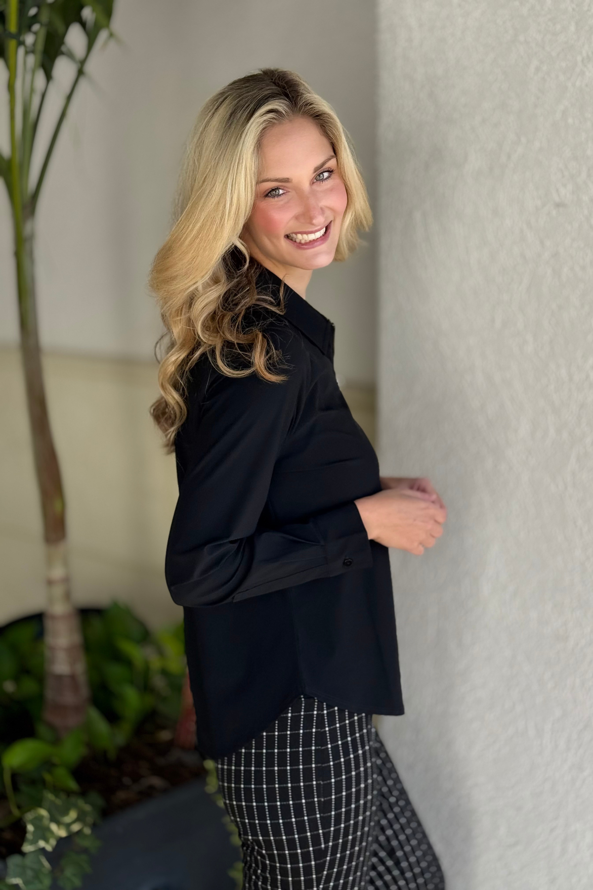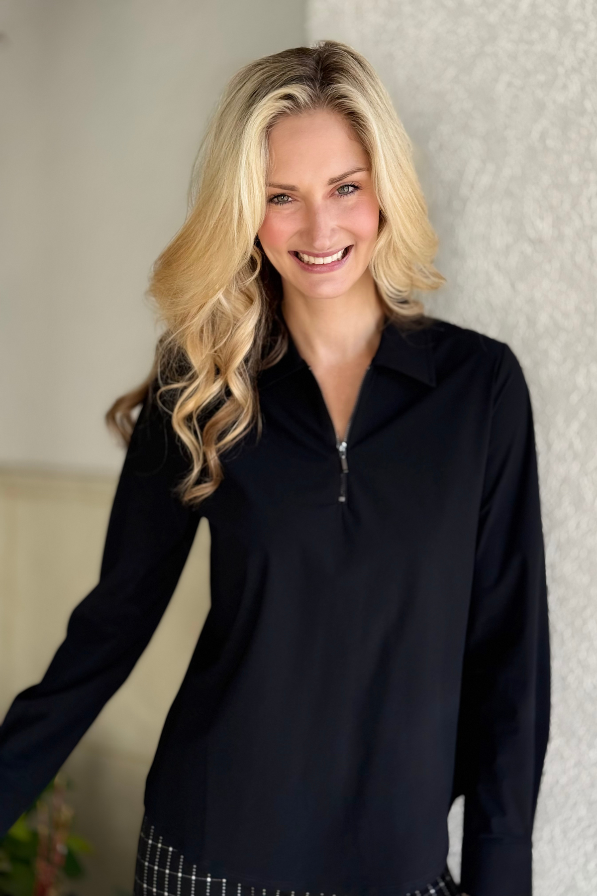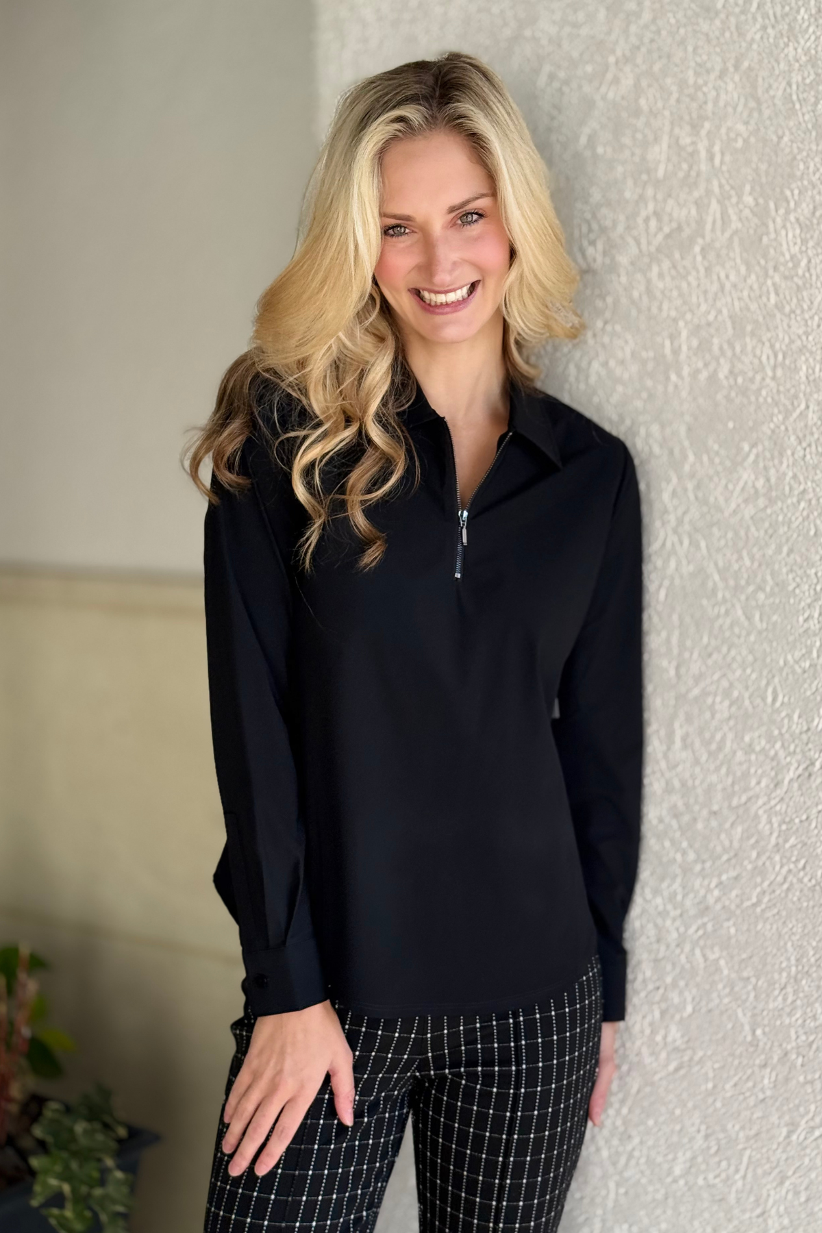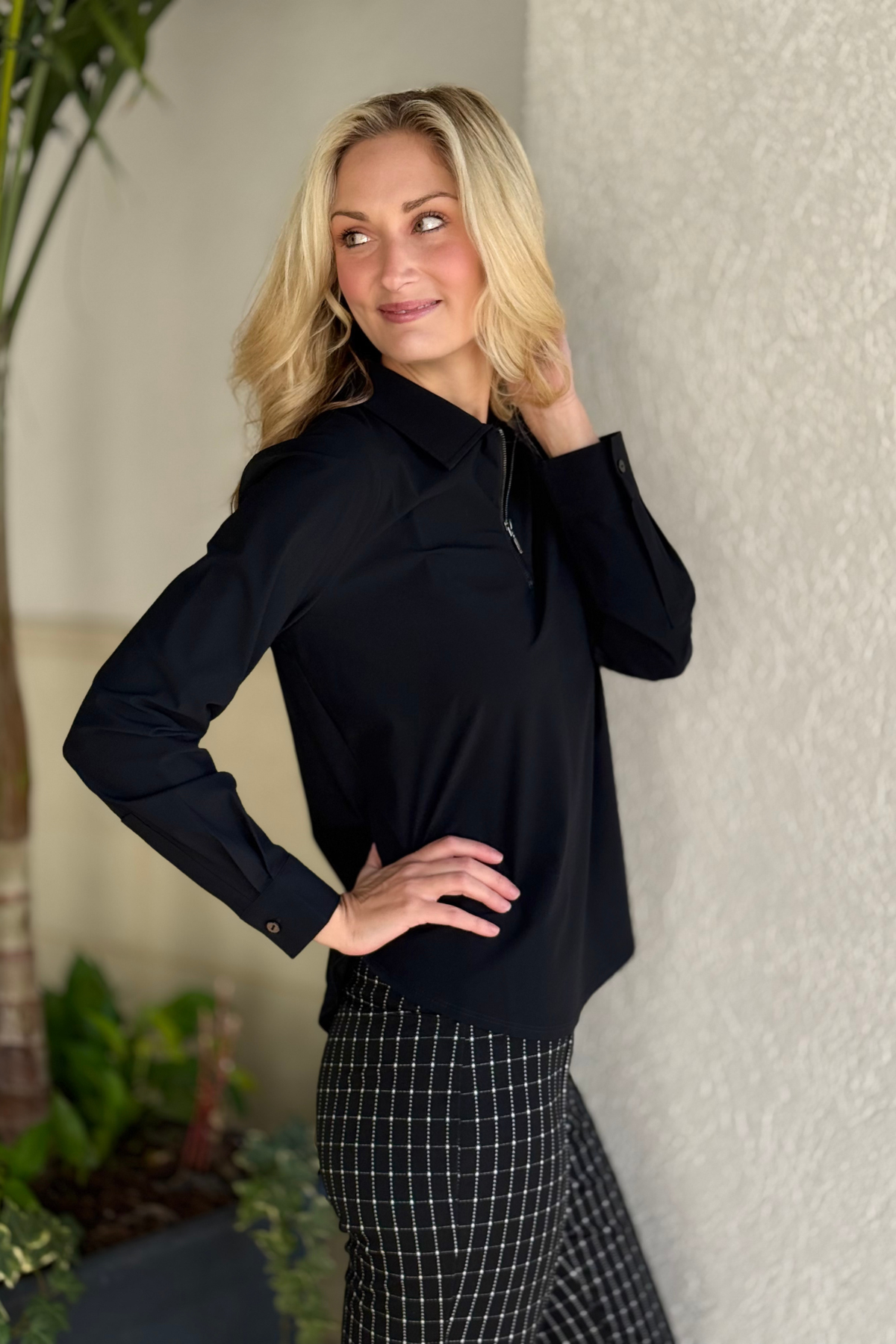Polished, comfortable, and endlessly versatile, the Liverpool Zip Front Collared Knit Top in Black is the ultimate wear-anywhere essential. Designed with a sleek half-zip neckline and refined button cuffs, this long-sleeve knit delivers a modern, tailored look that transitions seamlessly from work to weekend. The smooth stretch fabric offers a flattering, easy-moving fit, making it perfect for layering or wearing on its own. Zip it up for a clean, sophisticated finish or keep it slightly open for a relaxed, effortless vibe.