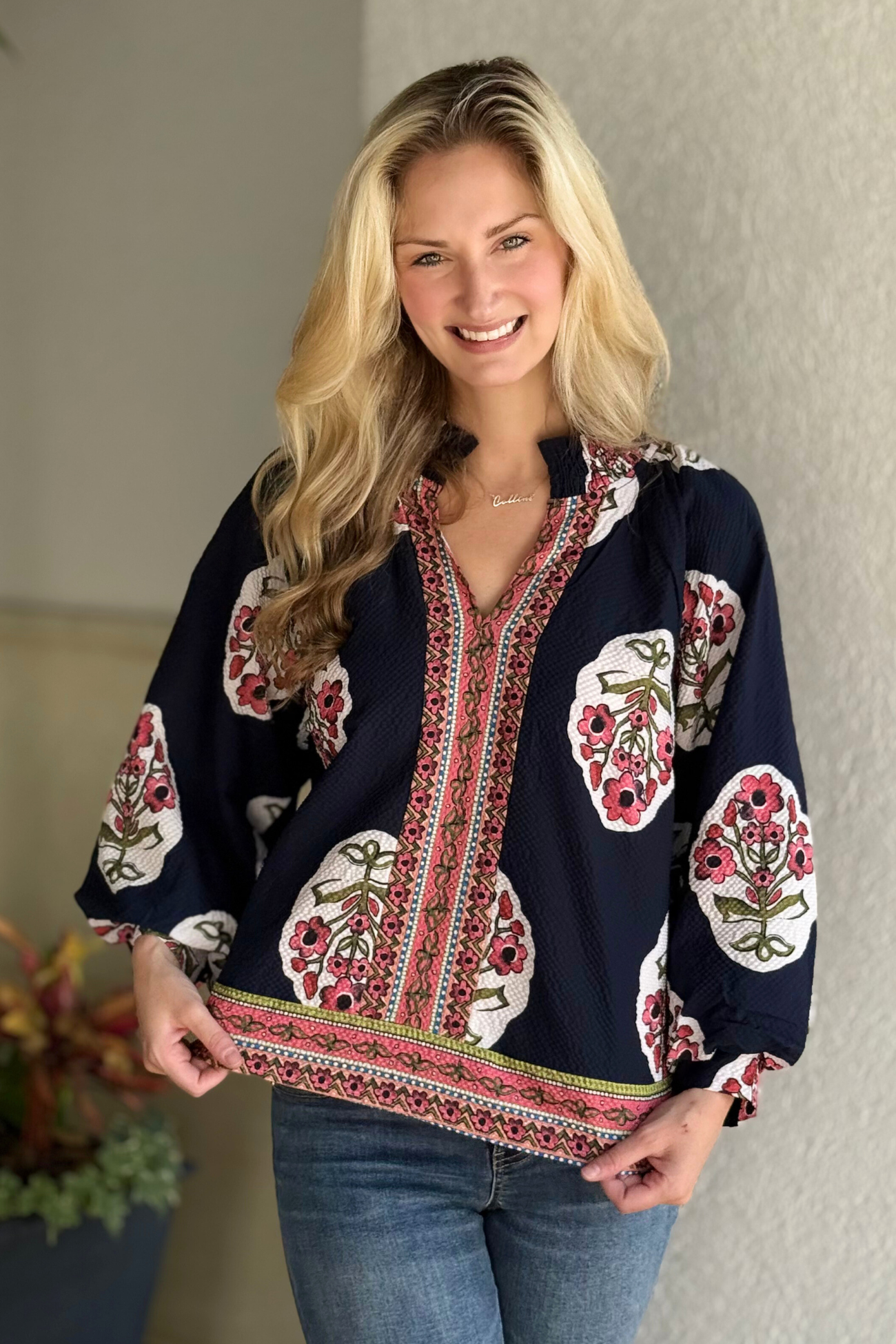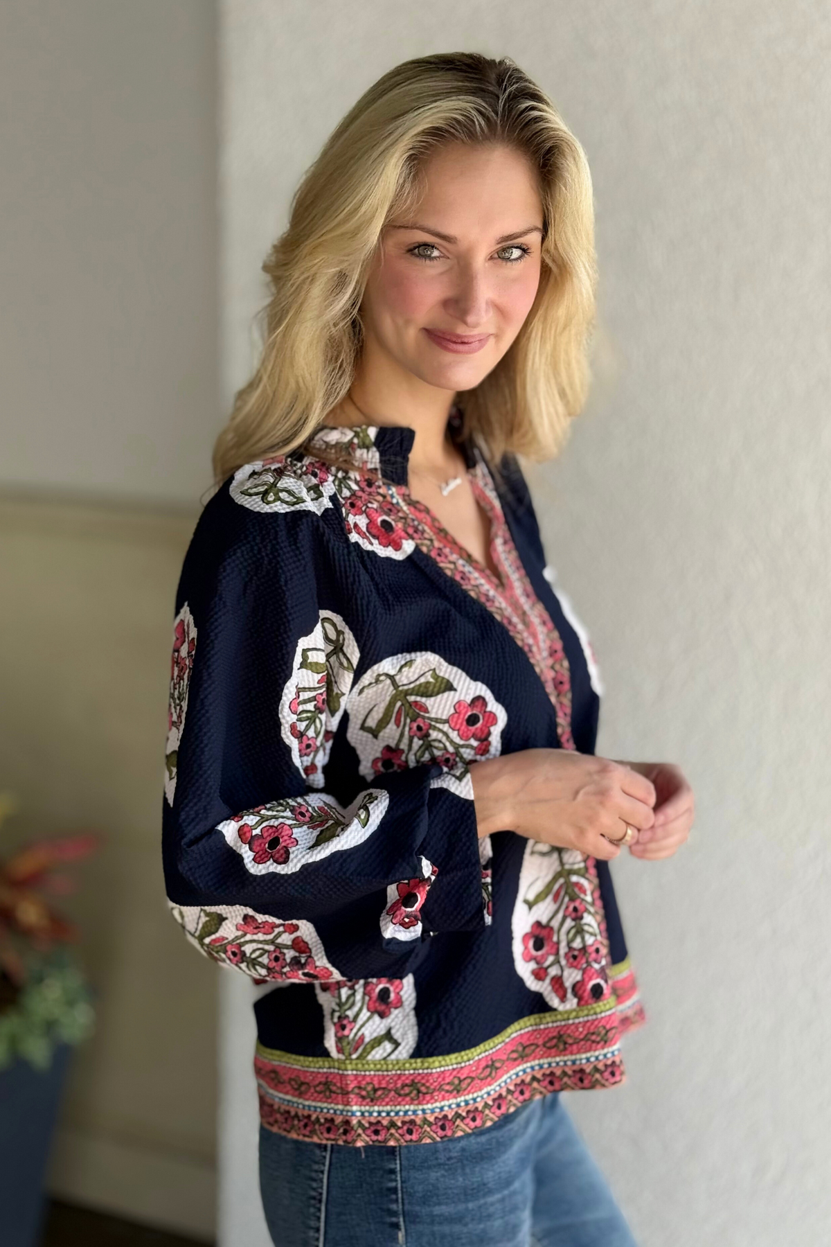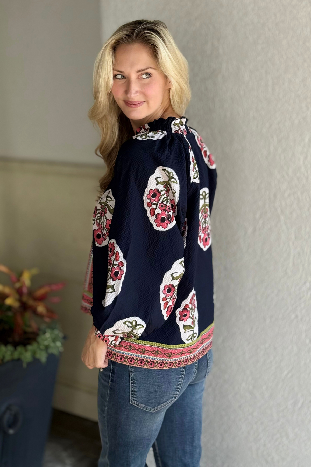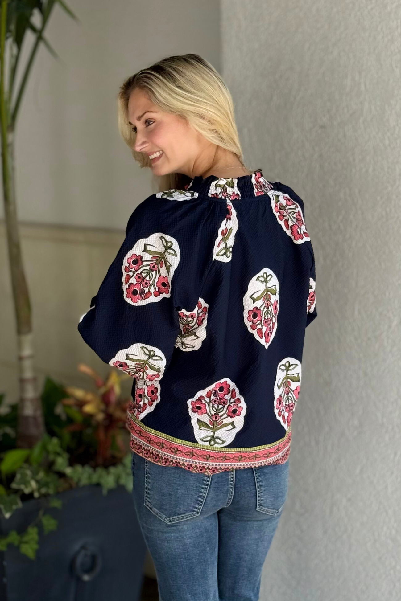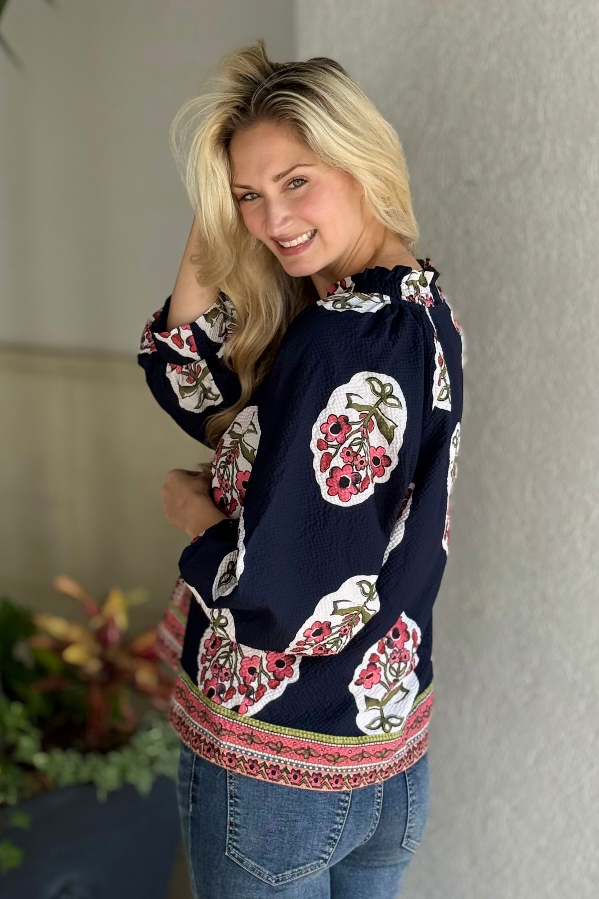 Bring effortless charm to your everyday style with the Midnight Garden Border Blouse in Navy. Crafted from textured fabric that adds depth and character, this blouse is highlighted with bold floral motifs framed by an intricate border print. The relaxed silhouette flows with ease, while voluminous ¾ sleeves and a smocked standing collar that opens into a flattering V-neckline give it a chic, modern touch. Finished with lined sleeves for comfort, this piece moves seamlessly from casual afternoons to polished evenings. Also available in Forest.