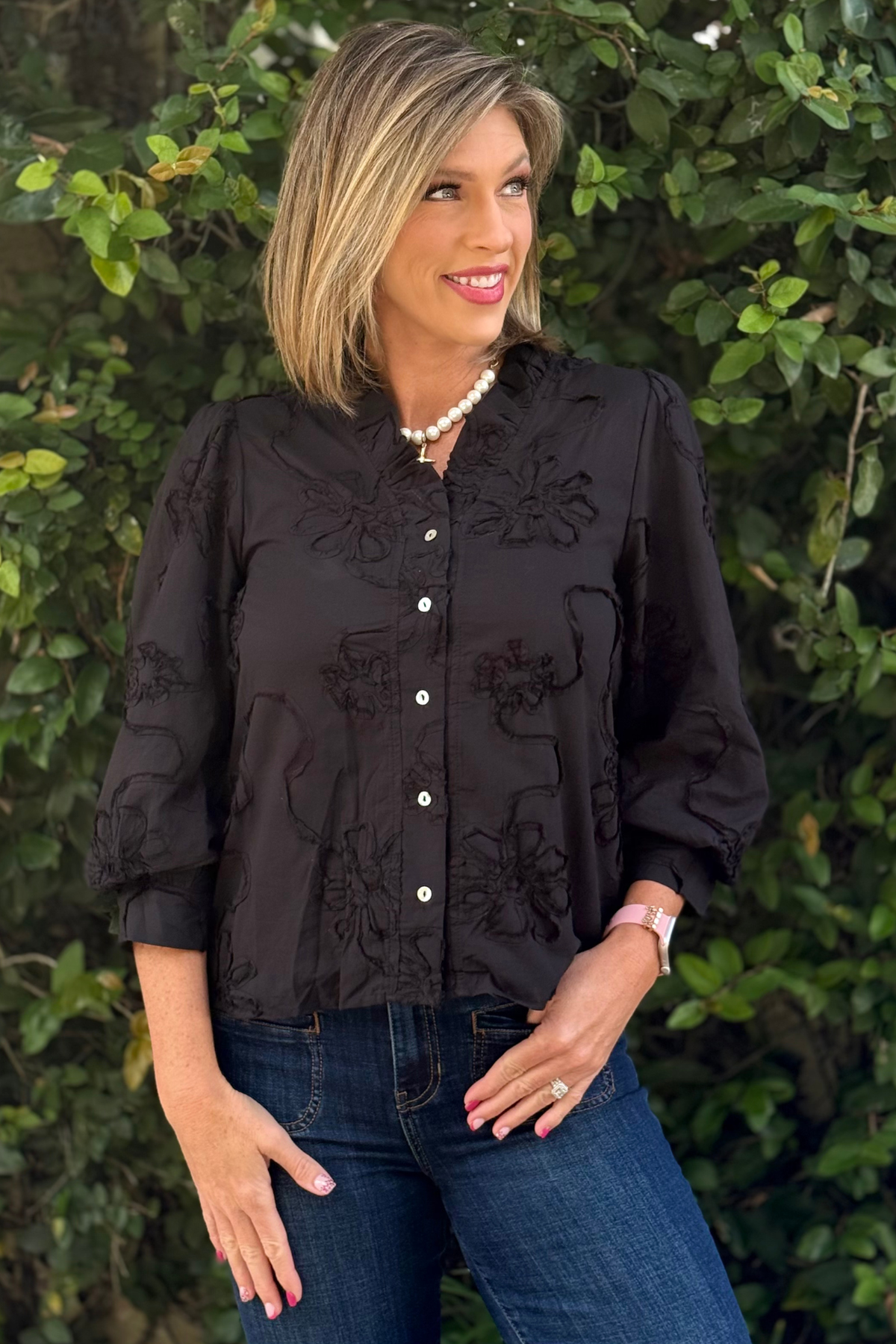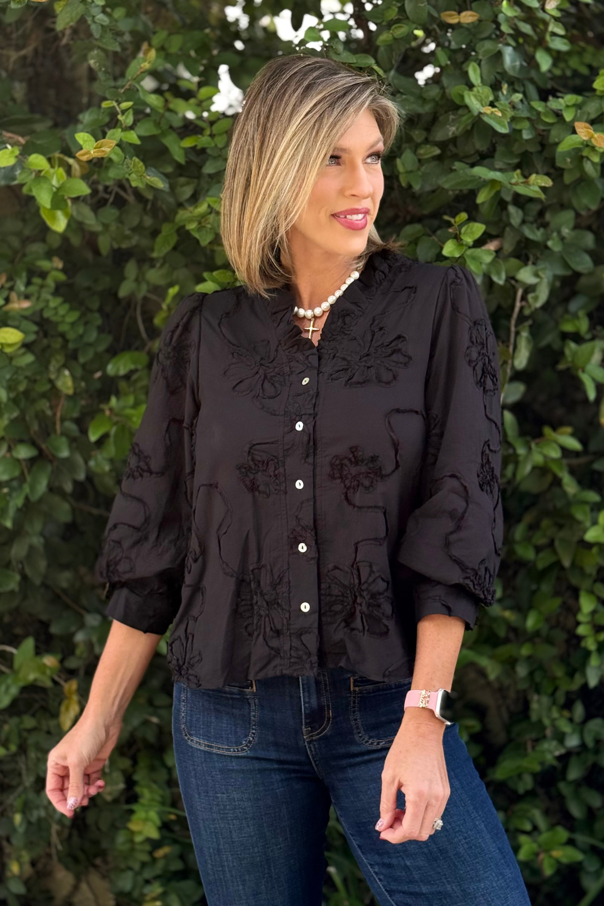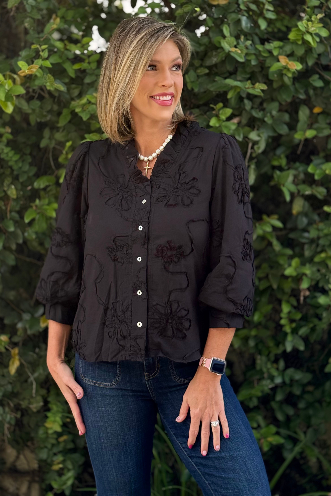 Elevate your everyday look with The Marlowe Textured Floral Button Top. This charming blouse features intricate 3D floral detailing that adds soft dimension and femininity to the lightweight, textured cotton fabric. Designed with 3/4 sleeves, a subtle ruffled neckline, and a button-down front, it’s the perfect blend of effortless elegance and comfort. The breathable 100% cotton keeps it comfortable all day, making it easy to style tucked or untucked. A statement piece that transitions seamlessly from weekday polish to weekend outings.