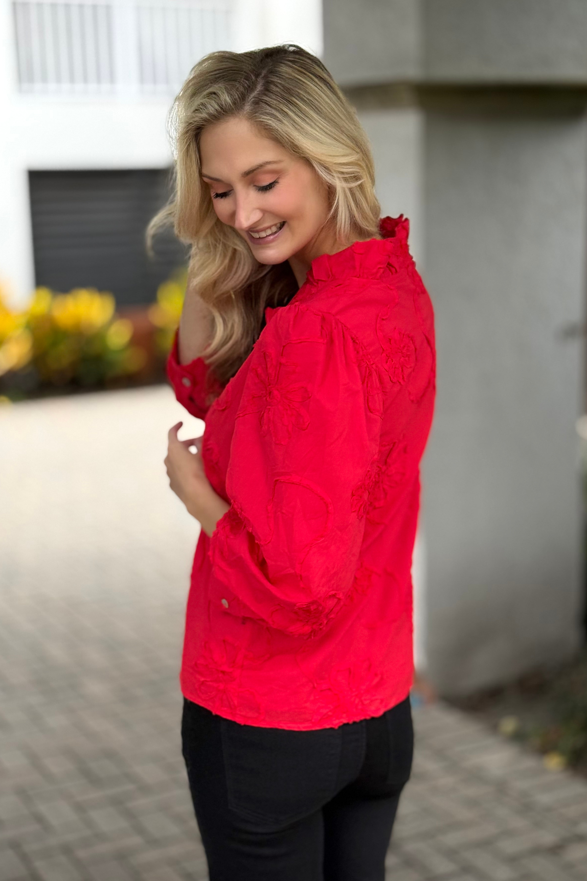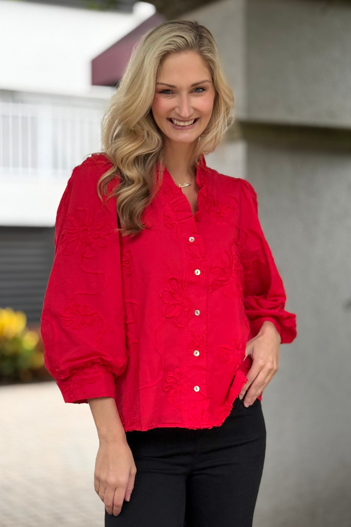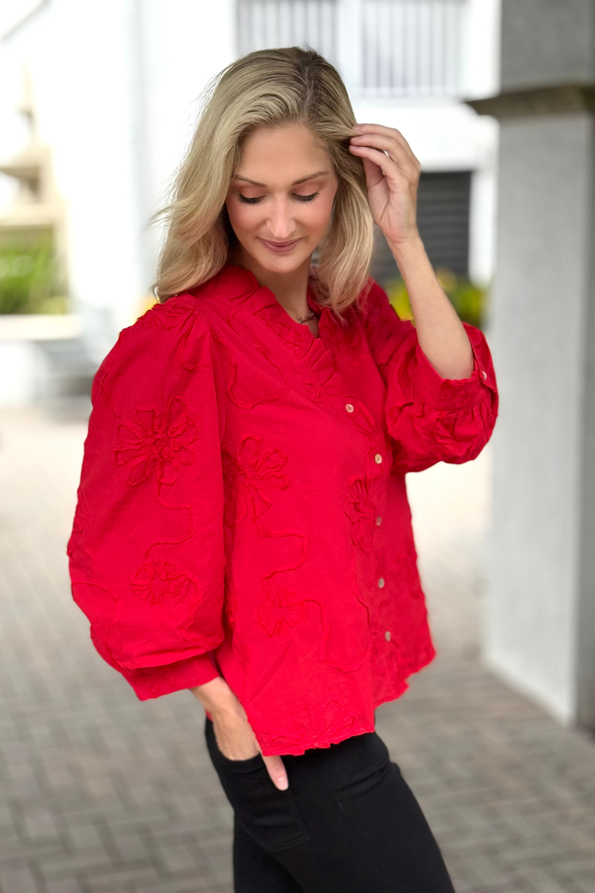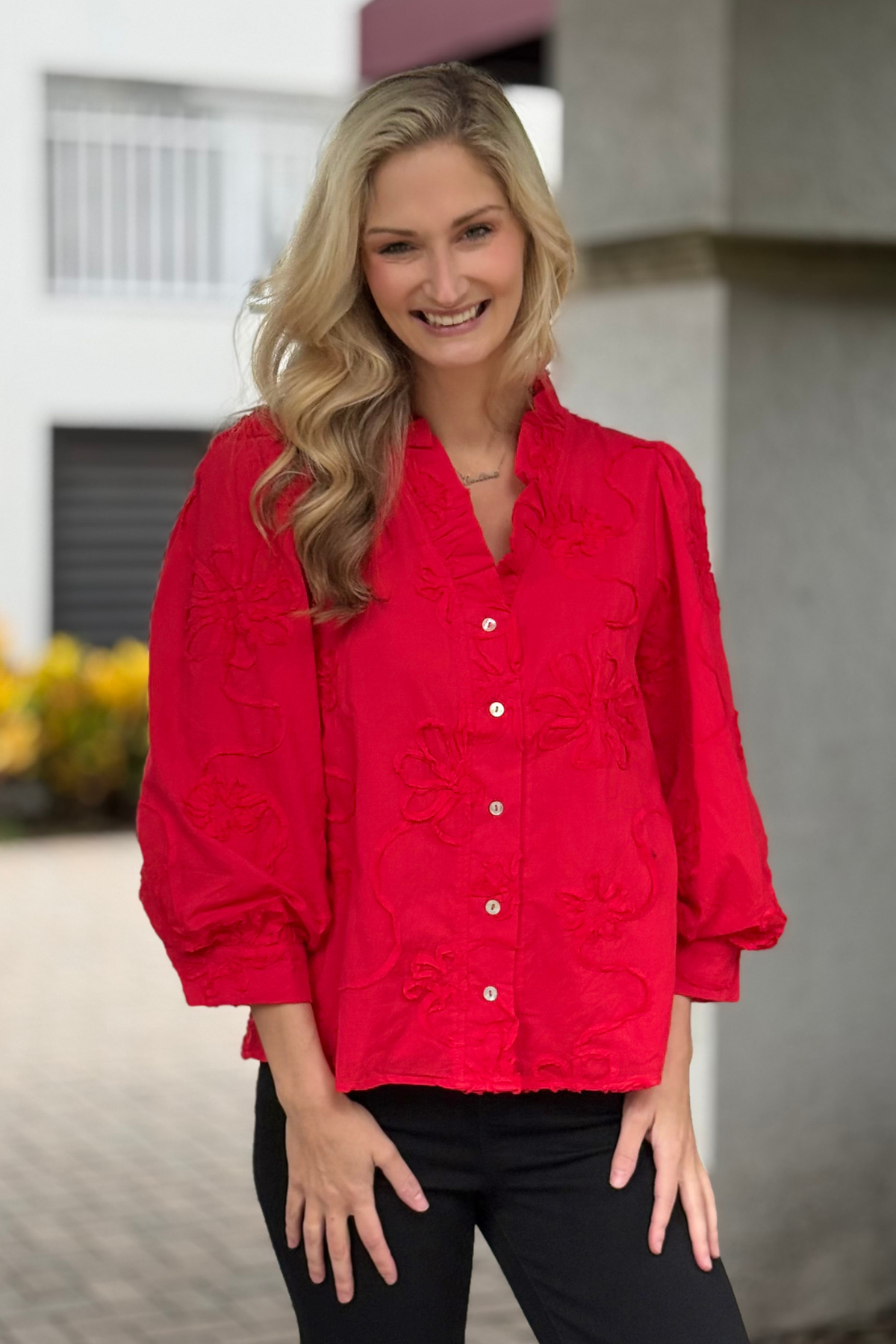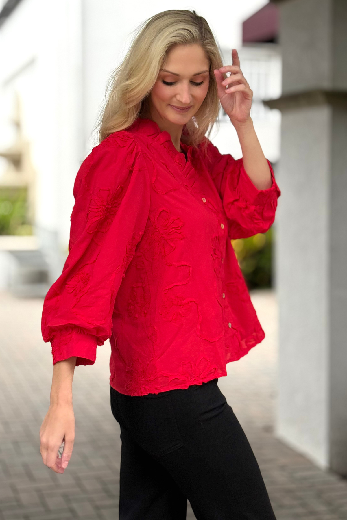 The Marlowe Textured Floral Button Top in Red
