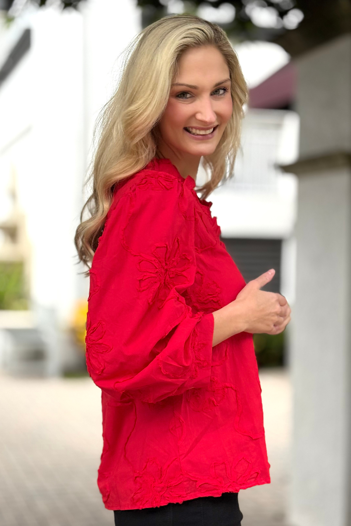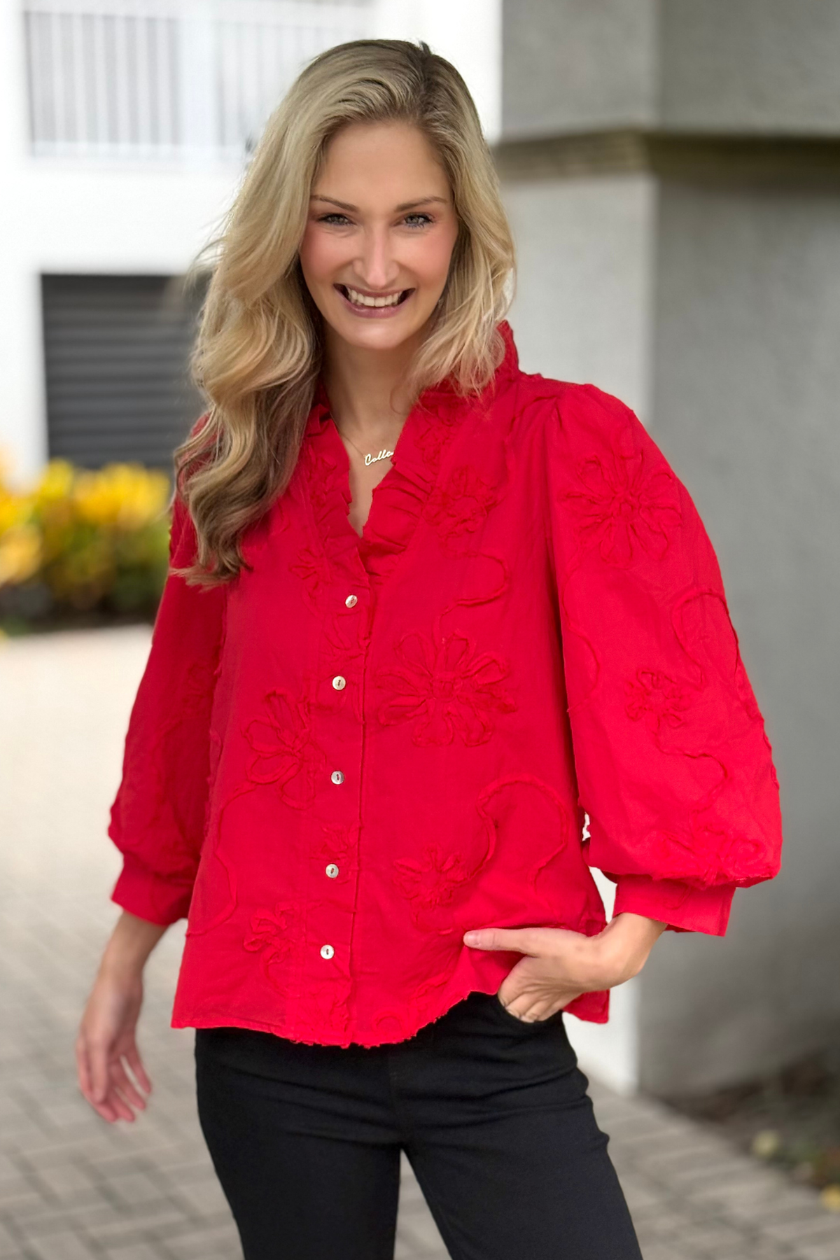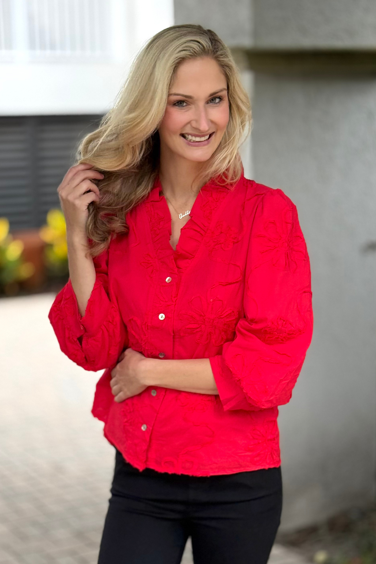 Elevate your everyday look with The Marlowe Textured Floral Button Top. This charming blouse features intricate 3D floral detailing that adds soft dimension and femininity to the lightweight, textured cotton fabric. Designed with 3/4 sleeves, a subtle ruffled neckline, and a button-down front, it’s the perfect blend of effortless elegance and comfort. The breathable 100% cotton keeps it comfortable all day, making it easy to style tucked or untucked. A statement piece that transitions seamlessly from weekday polish to weekend outings.