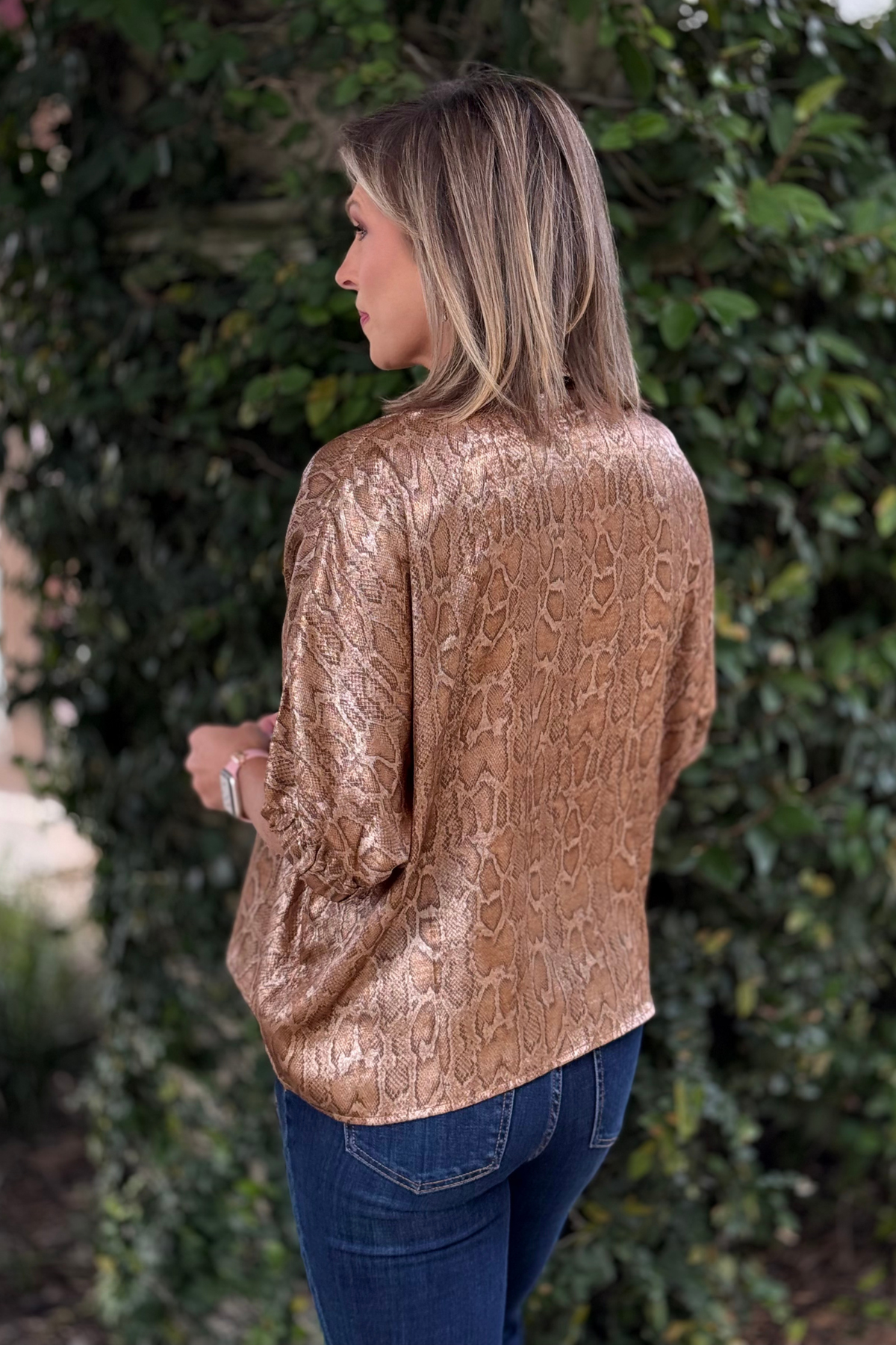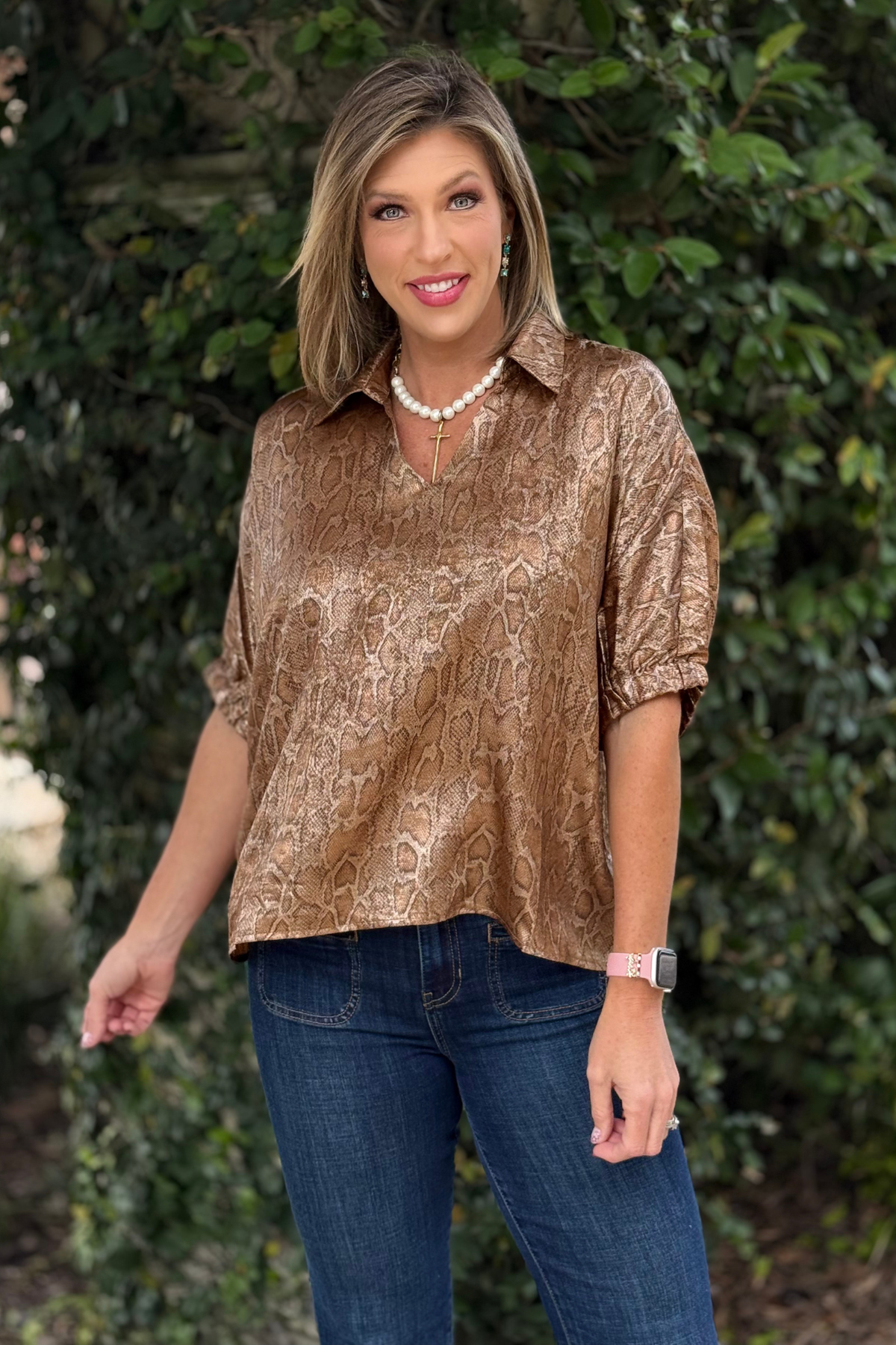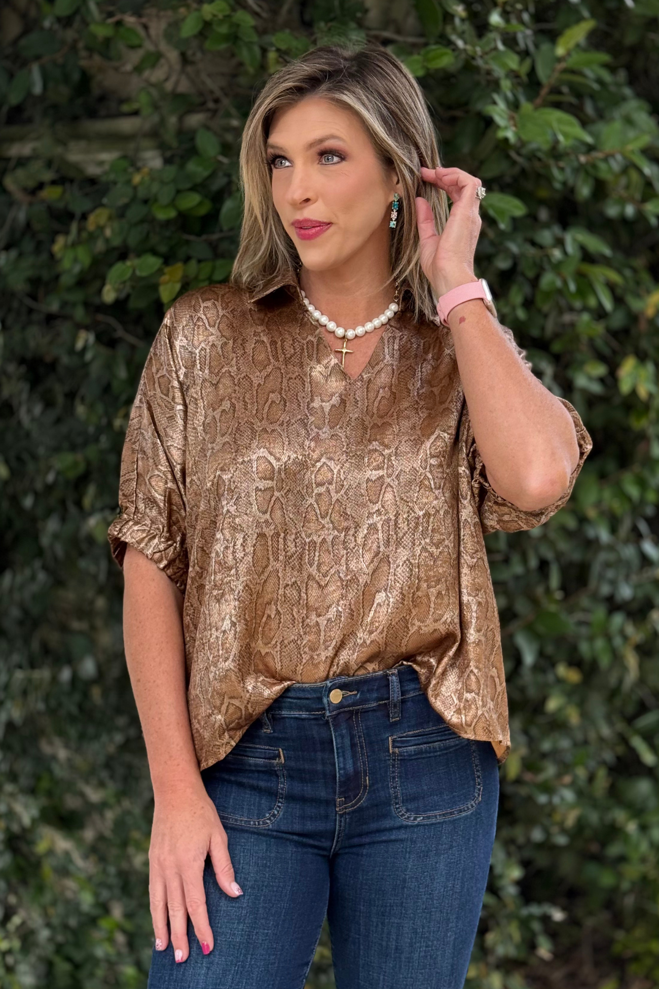 The Milan Snakeskin Shimmer Top adds just the right amount of edge and elegance to your wardrobe. Featuring a chic snakeskin print with a subtle sheen, this lightweight blouse is designed with a flattering modest v-neckline, collared detail, and elastic sleeves for a comfortable fit. Its extended short sleeves and easy drape make it perfect for pairing with denim or dressy pants. Whether you’re heading to date night or a holiday party, this top brings effortless confidence and modern style. Available in Gold and Pearl.
