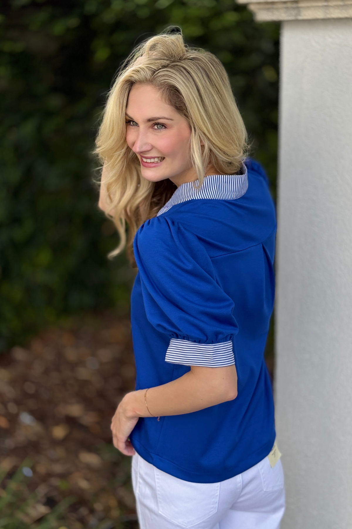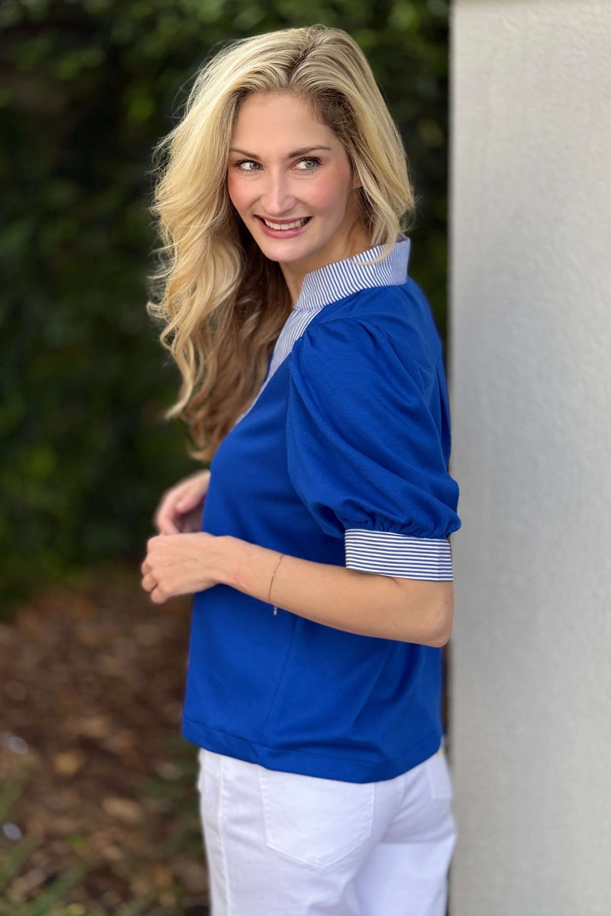 Classic with a bold twist π The Royal Prep Puff Top features short puff sleeves, a chic high neckline, and crisp striped contrast accents at the collar and cuffs for that elevated, designer-inspired feel. The vibrant royal blue makes a statement while the relaxed fit keeps it effortlessly wearable. Pair it with white denim, trousers, or shorts for a polished look that still feels fun and fresh.
