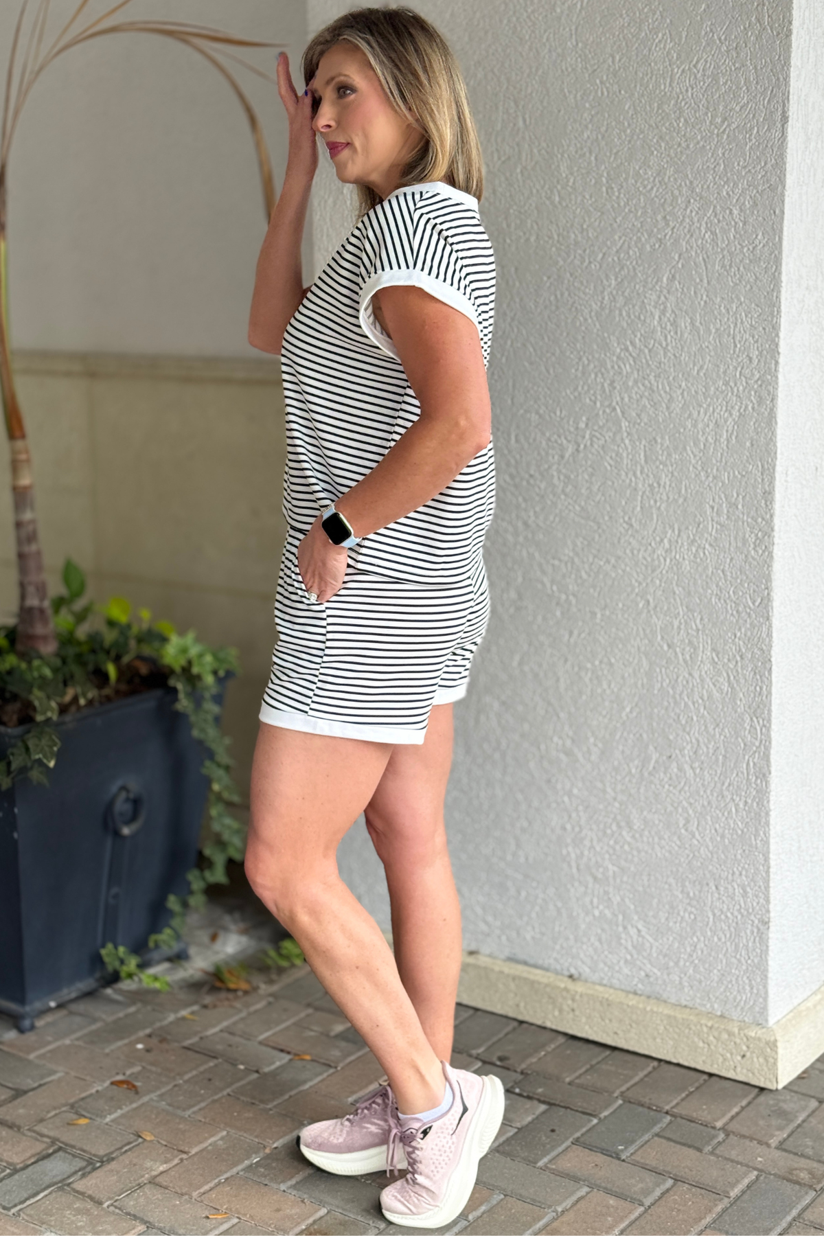 Meet the set you’ll reach for on repeat—now in timeless black and white 🖤 The Sweetest Thing Striped Lounge Set is designed with both comfort and effortless style in mind. This easy two-piece look features a waist-length striped top with a classic round neckline, relaxed short sleeves, and a flattering, laid-back fit. The matching pull-on shorts are designed with an elastic waistband, adjustable drawstring, and side pockets for the perfect mix of function and comfort. Lightweight, breathable, and ultra-soft, this set is perfect for lounging at home, running errands, or stepping out in casual, sporty-chic style.