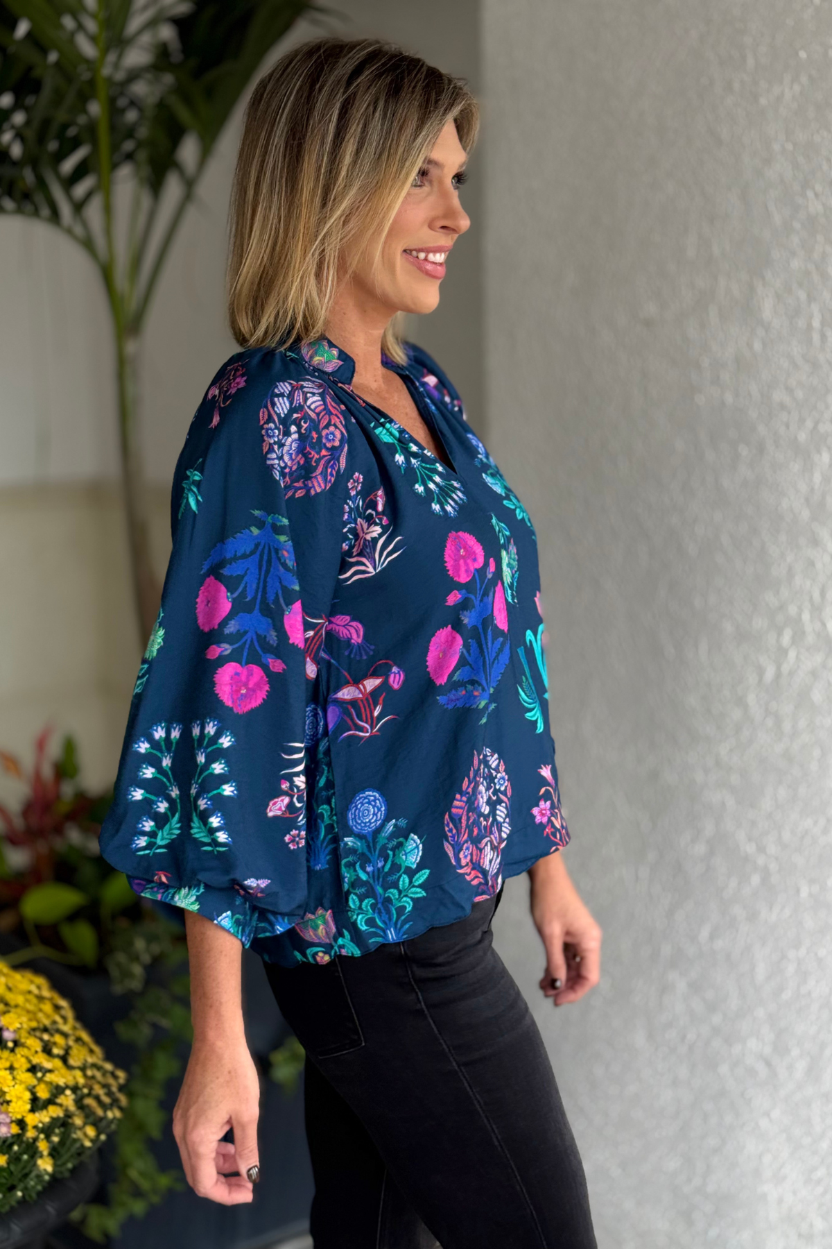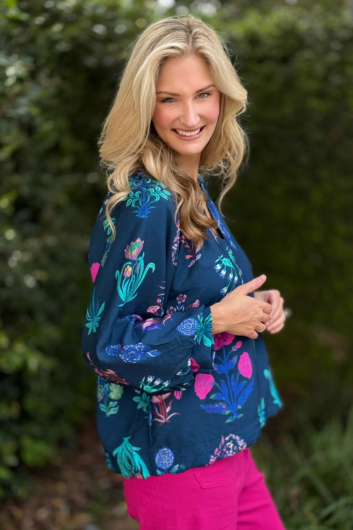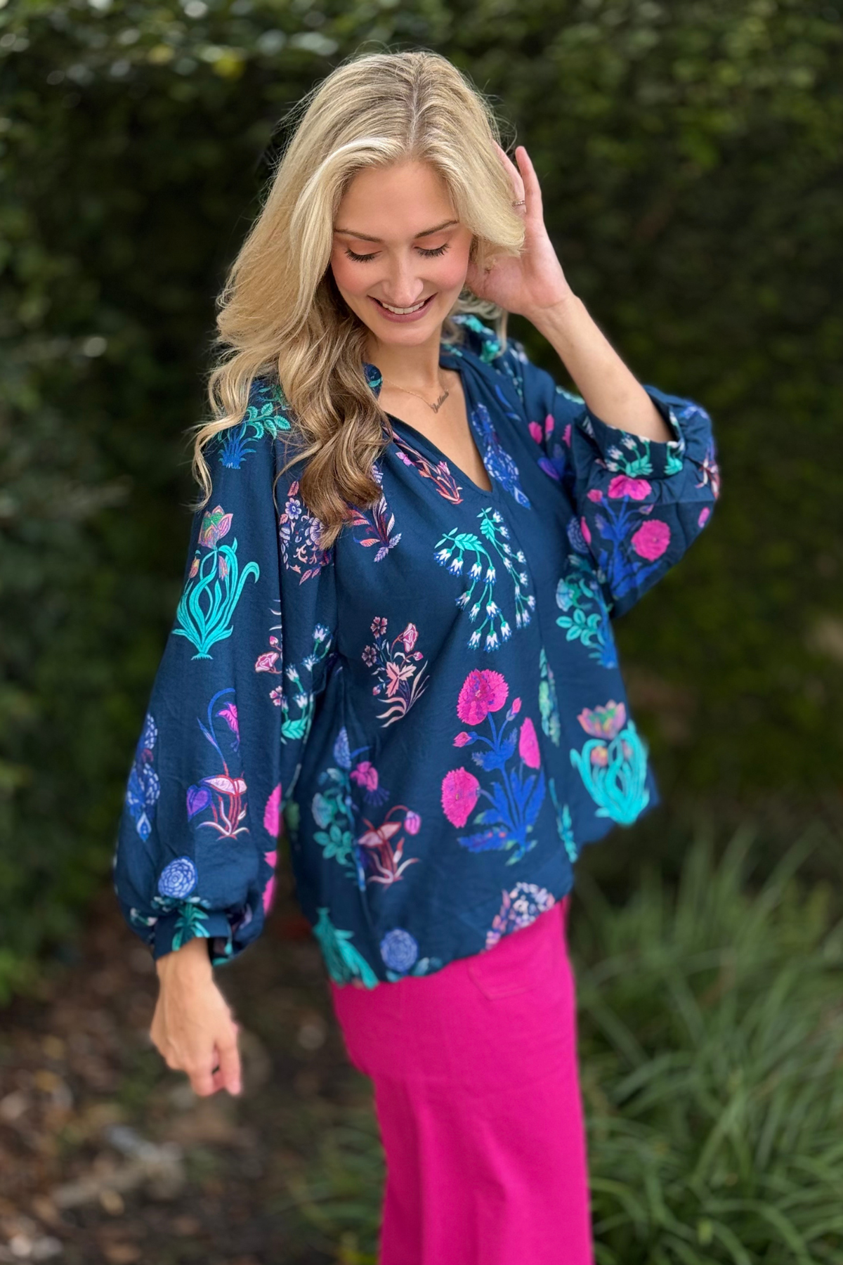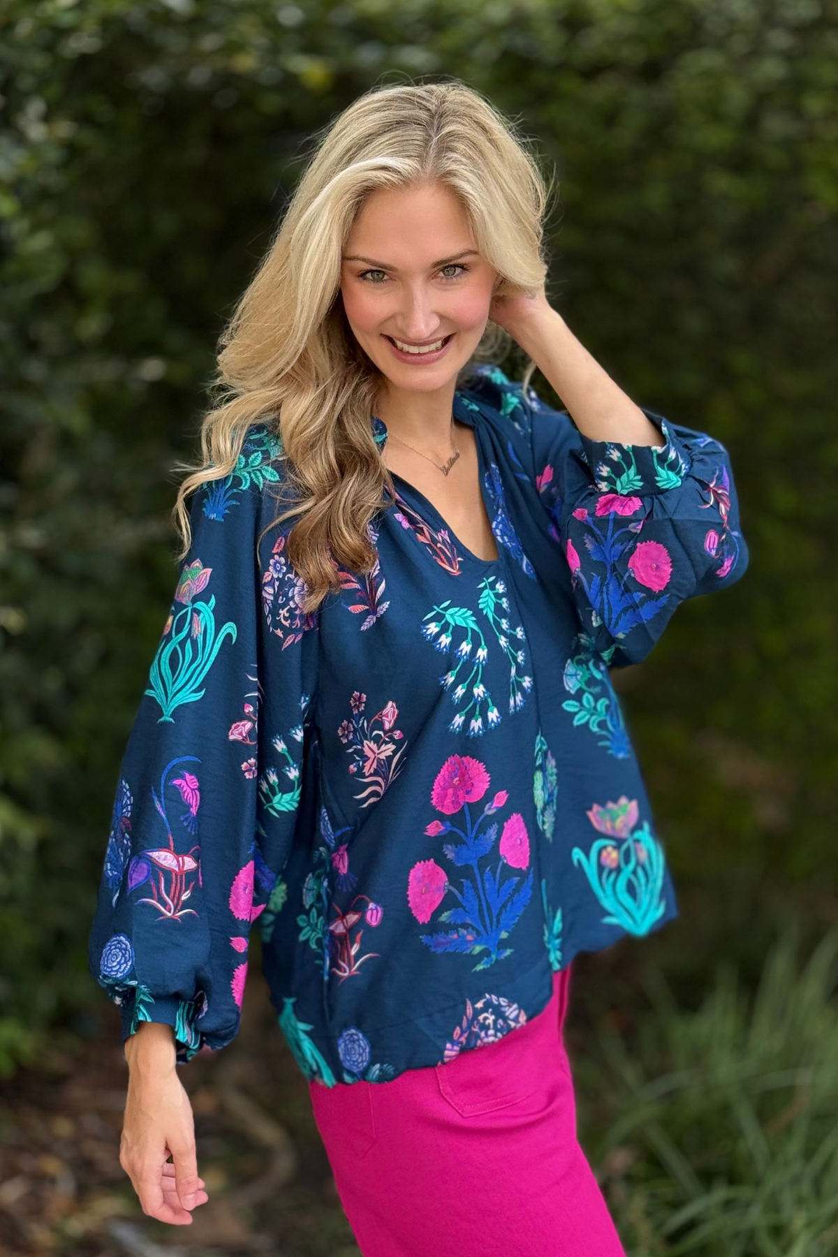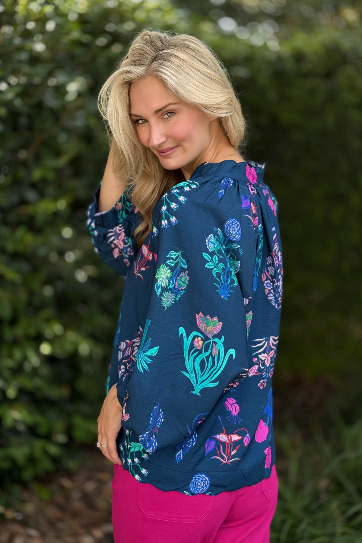 Elevate your wardrobe with The Twilight Botanica Blouse, a dreamy blend of elegance and ease. Designed in a rich navy floral print with vibrant botanical accents, this blouse is perfect for both day and evening. The flattering split neckline, scalloped hem, and flowy 3/4 sleeves create a relaxed yet polished silhouette. Fully lined for comfort, this blouse pairs beautifully with denim, trousers, or skirts, making it a versatile go-to for any season.