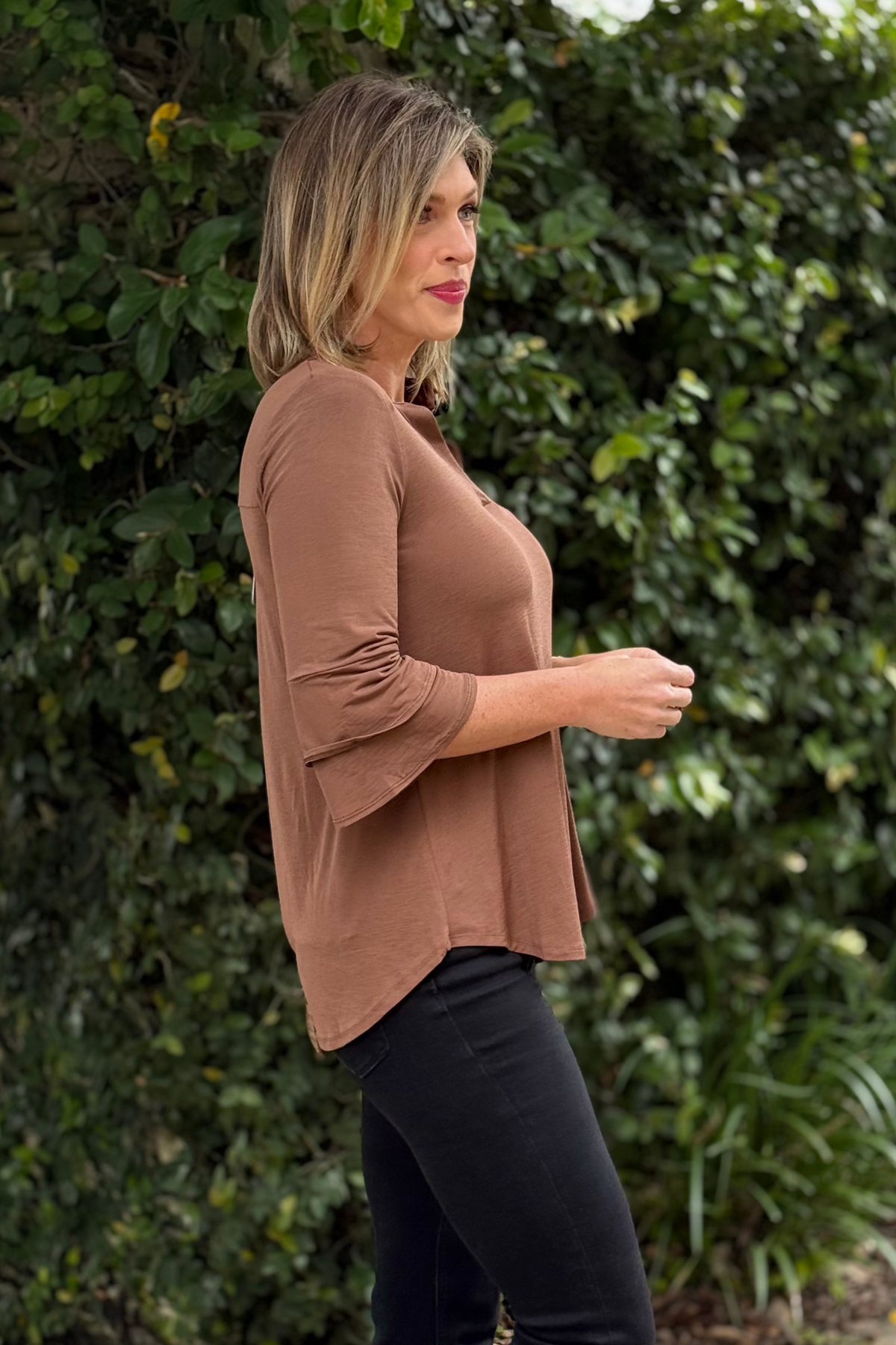 Say goodbye to ironing and hello to effortless style with the TPN Dark Mocha Bell Sleeve Top. Crafted from our signature wrinkle-free, ultra-soft fabric, this top offers a flattering fit for every body type. Designed with a relaxed silhouette and a refined Lizzy neckline, it’s finished with beautifully tiered bell sleeves that bring a touch of romantic charm.