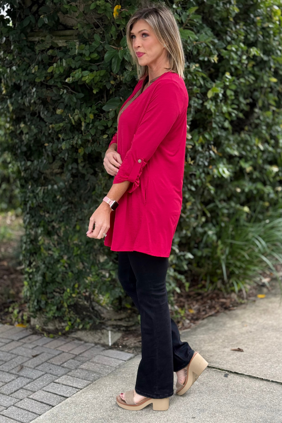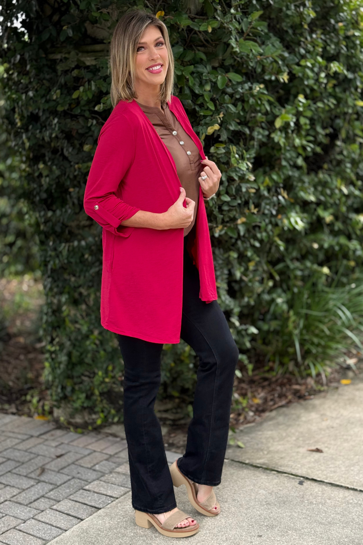 Part of our TPN Collection, the Jewel Essential Open Cardigan in Jewel Red is a vibrant wardrobe staple that instantly elevates any look. Made from our bestselling wrinkle-free Bulgari fabric, it’s soft, smooth, and always polished—no matter how long you wear it. The open-front design pairs effortlessly with tanks, tees, and dresses, while the roll-tab sleeves and functional pockets add everyday ease. Lightweight, breathable, and endlessly versatile, it’s the cardigan that does it all.