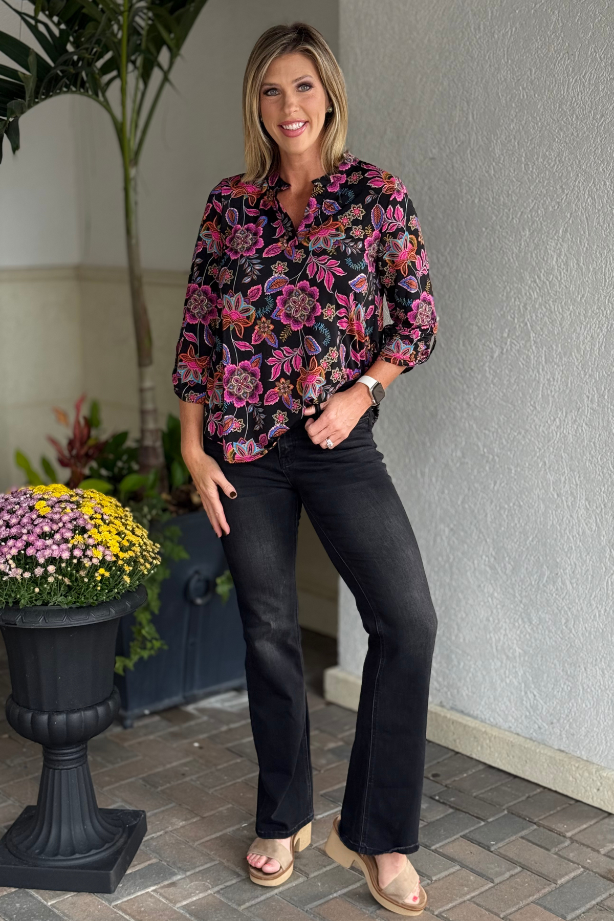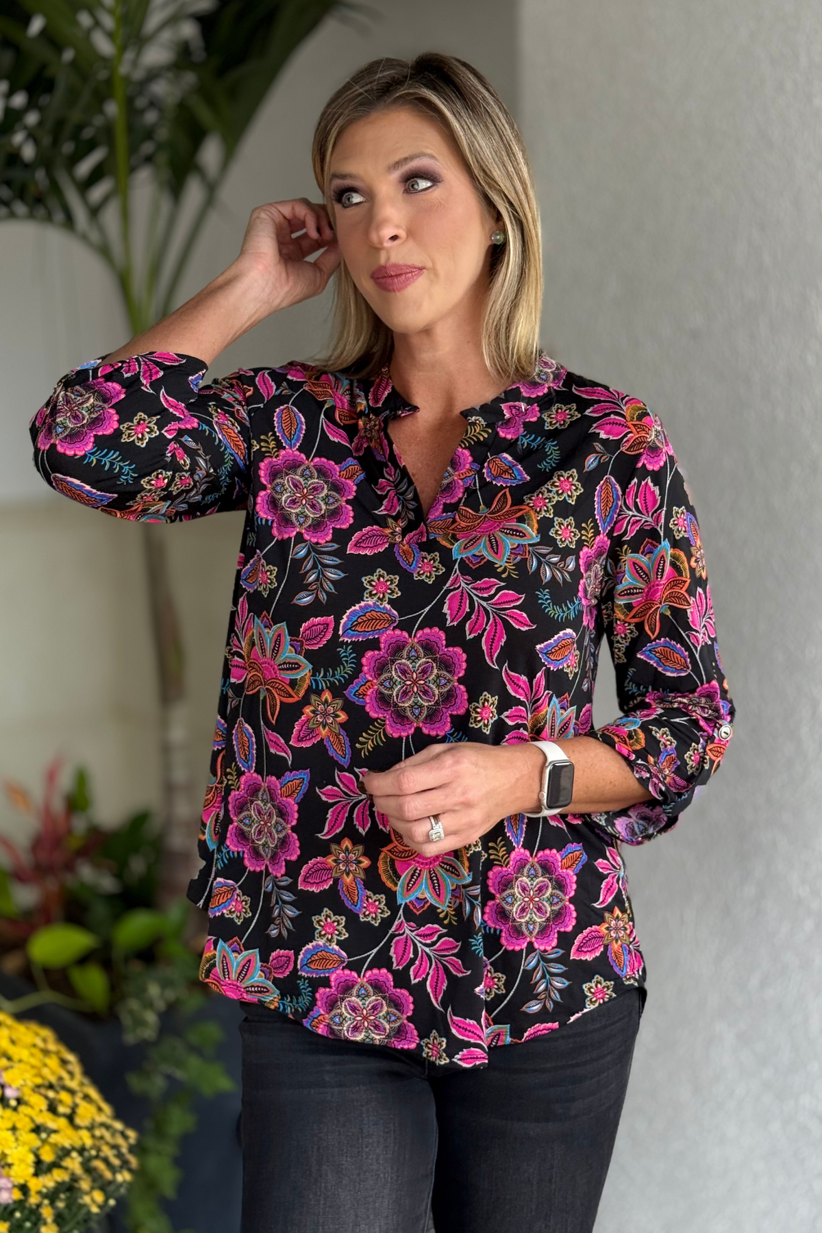 Bring effortless charm to your wardrobe with the Starlit Meadow Top from the TPN Collection. This wrinkle-free, travel-friendly top features a vibrant floral print on a black base with pops of color, perfect for work, weekend outings, or travel. Crafted from a soft, luxurious poly blend, it provides lightweight comfort that’s cooler than linen and easy to care for. Designed with a mandarin collar neckline, 3/4-length sleeves with tab details, and a relaxed, flowy fit with a subtle high-low hemline, this top offers a flattering silhouette and polished style with minimal effort.