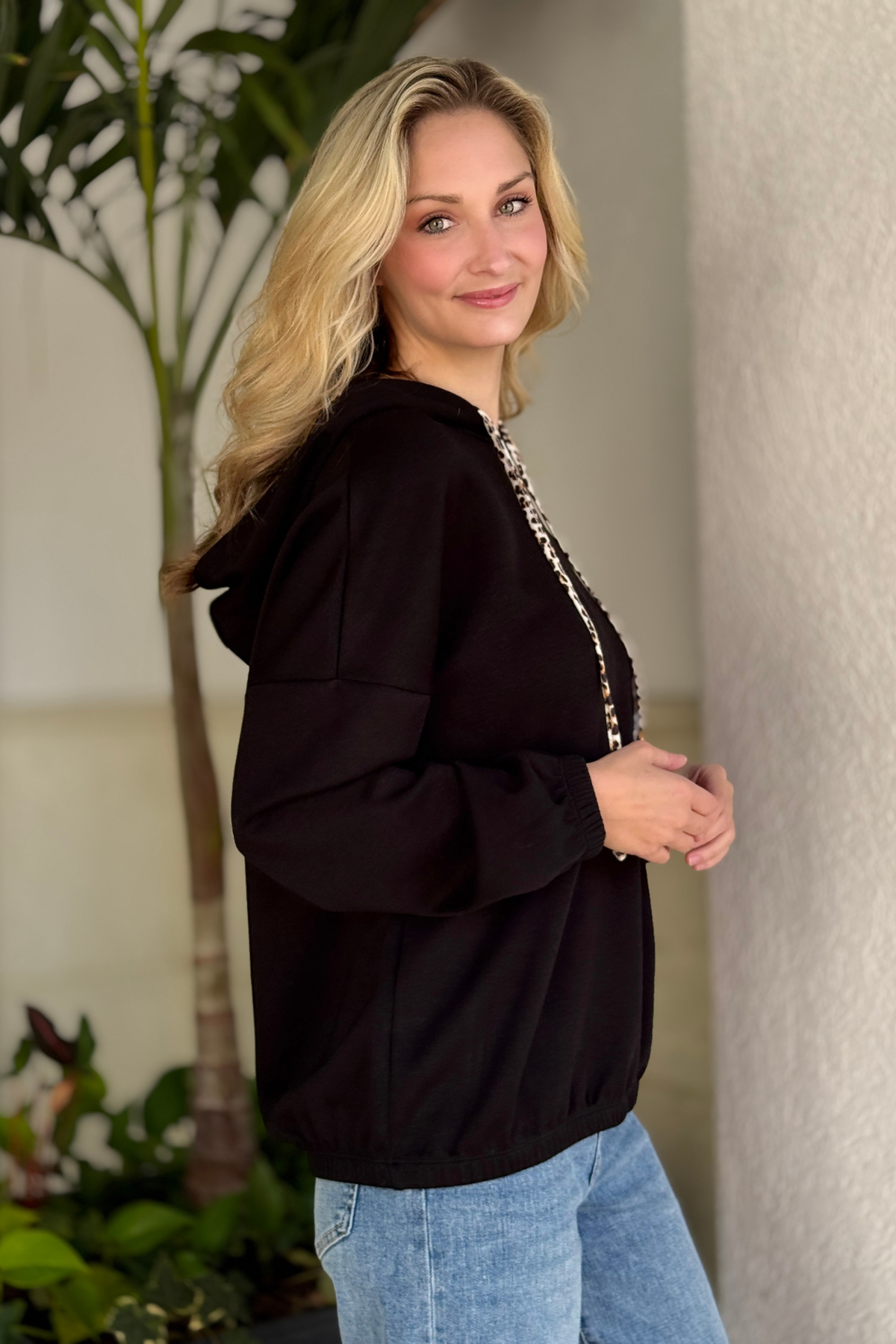 Meet your new go-to layer for effortless everyday style. The Wild Side Comfort Leopard Drawstring Hoodie combines cozy comfort with subtle statement details. Designed with a relaxed, baggy fit, this hoodie features a soft black body accented by leopard print drawstrings for a touch of fun flair. Perfect for casual days, travel, errands, or lounging, this versatile hoodie pairs effortlessly with denim, leggings, or joggers for an easy, pulled-together look.