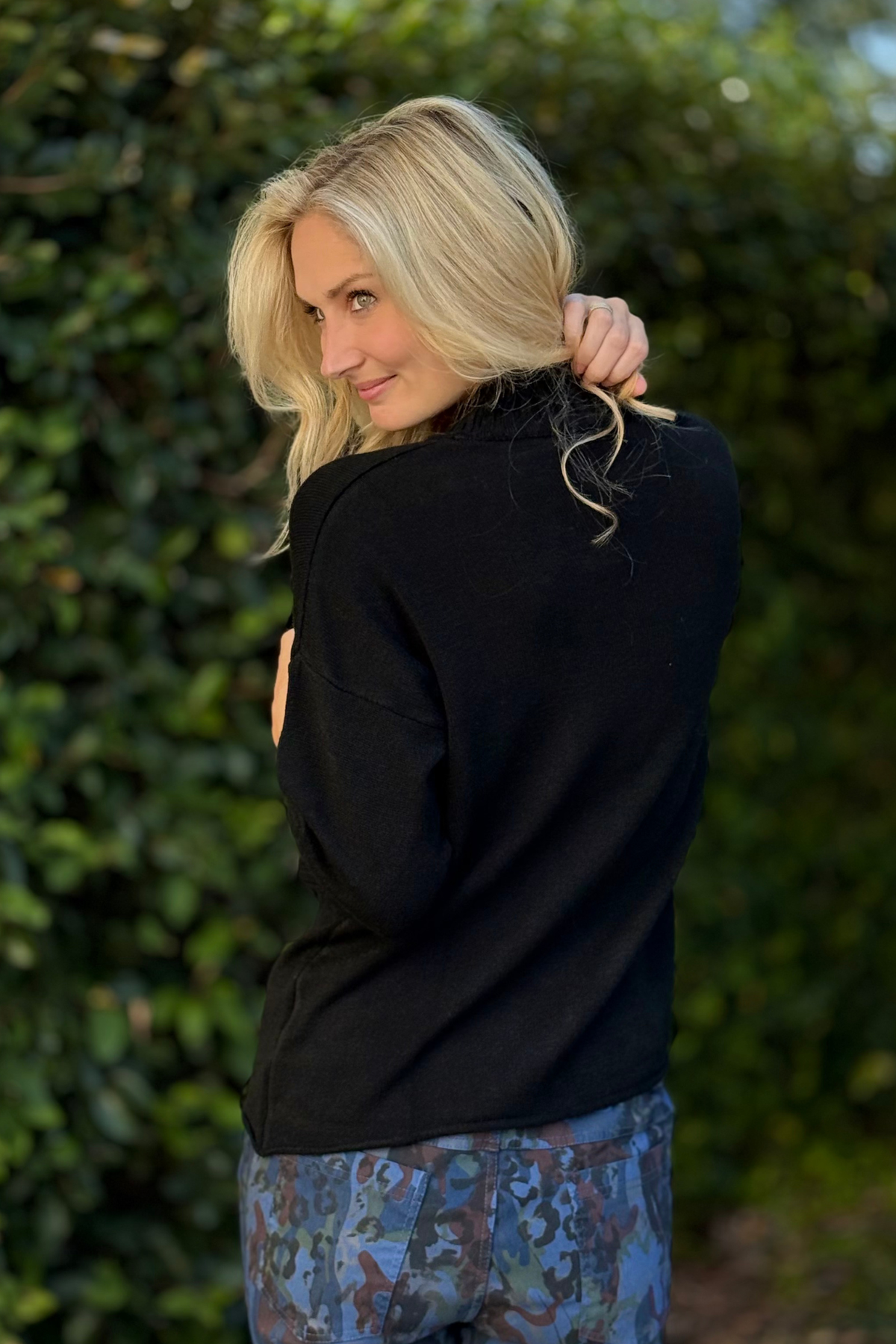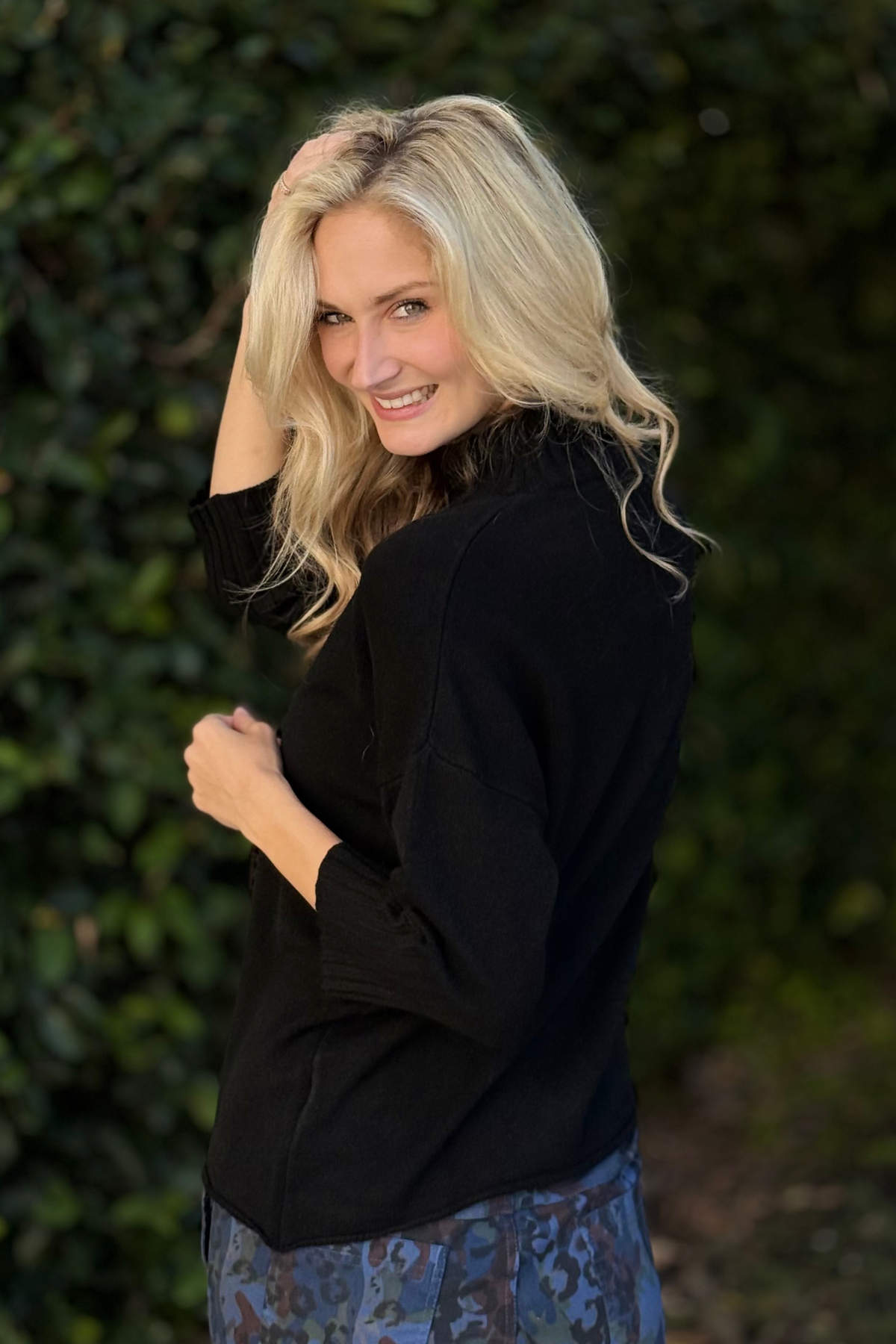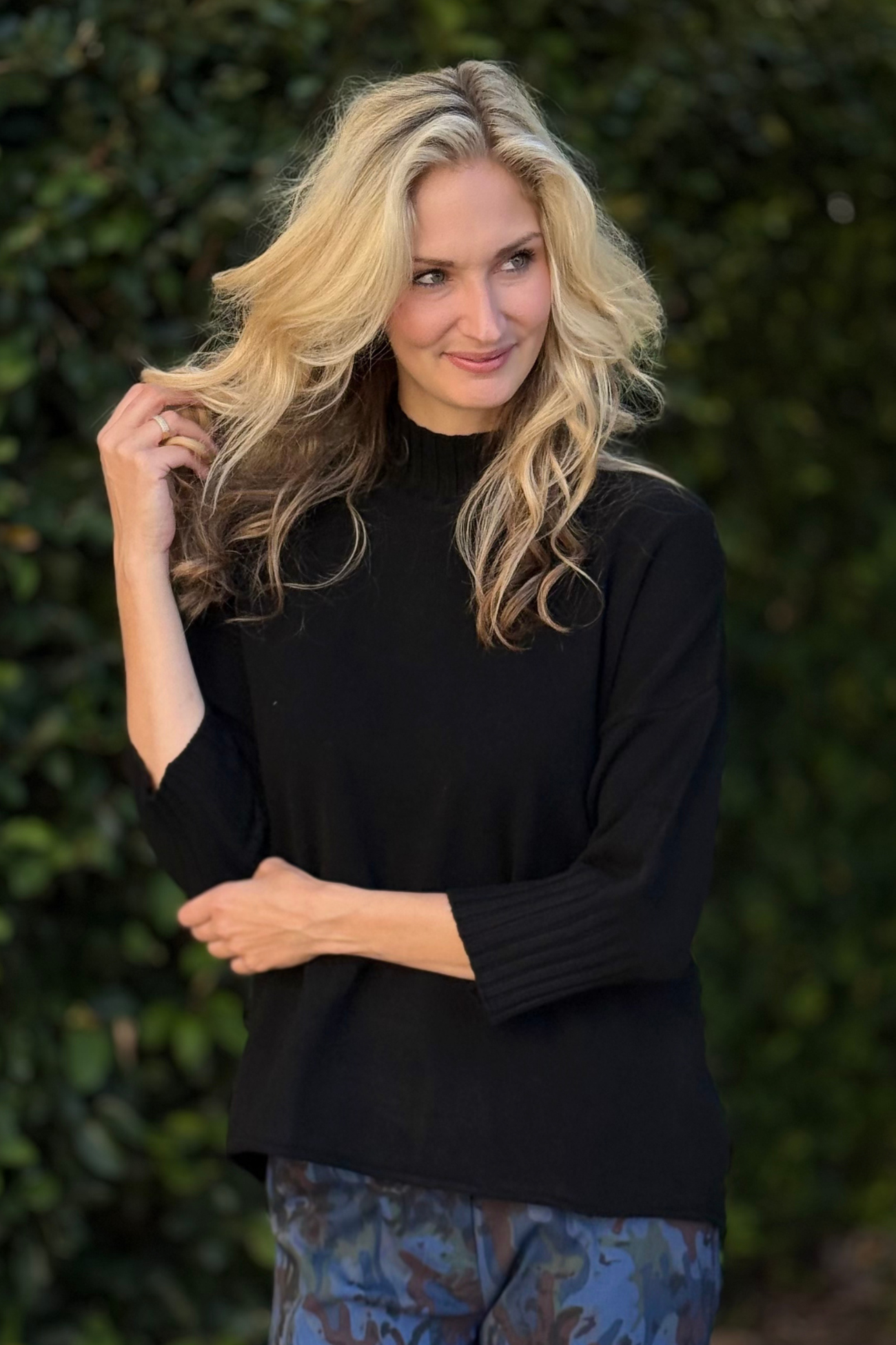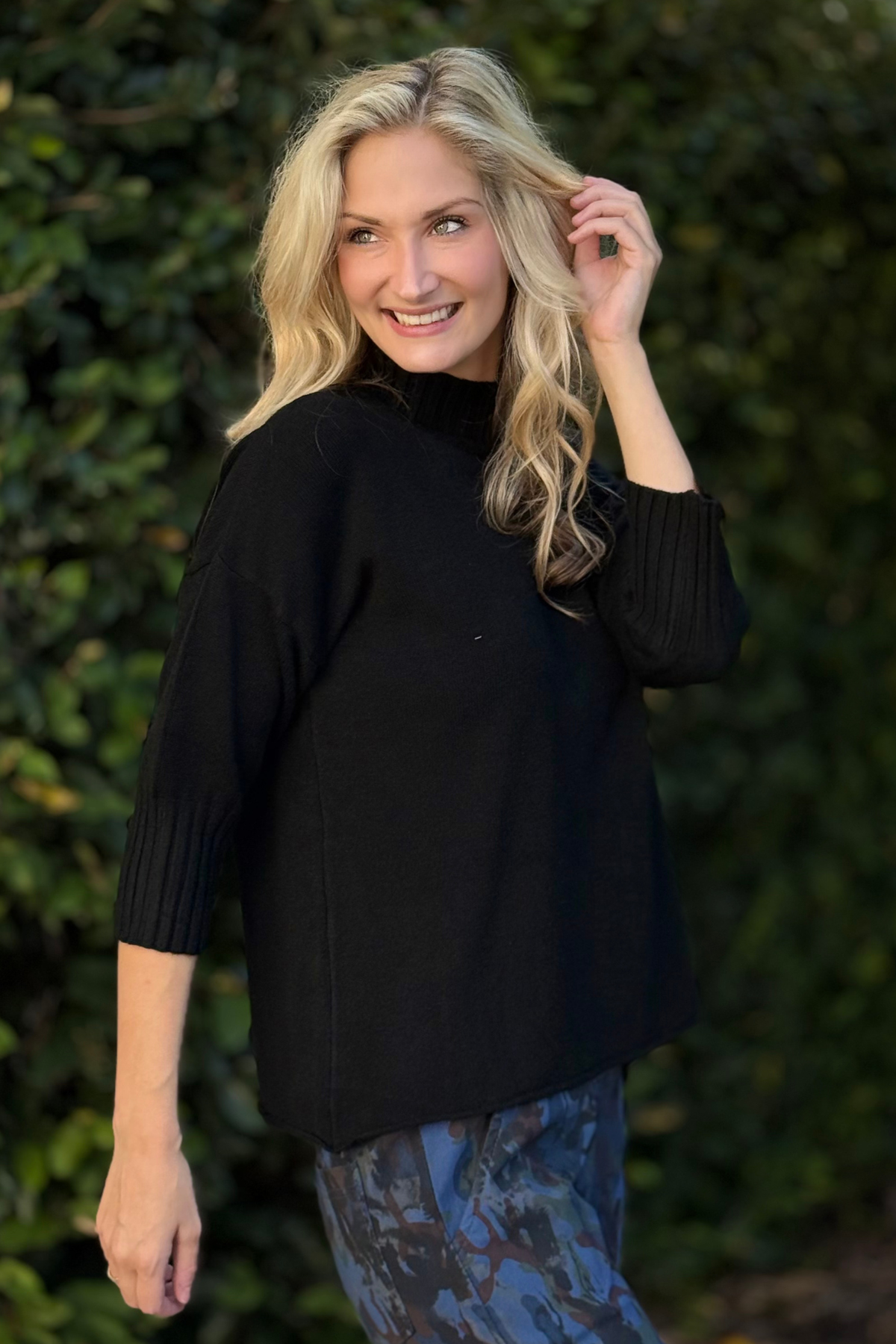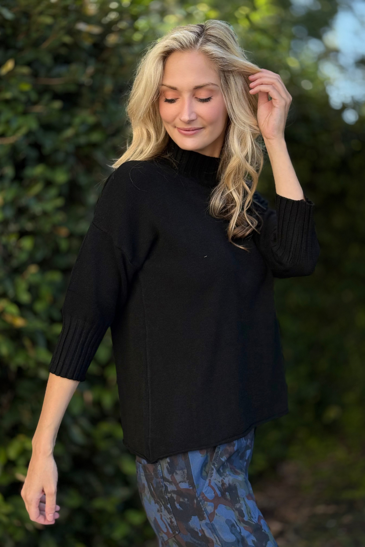 Effortless sophistication meets everyday comfort with the Flora Ashley Mock Neck Knit Sweater in classic black. Made in Italy, this luxe knit features a soft, relaxed silhouette with ribbed detailing at the neckline, cuffs, and hem. Perfect for layering or wearing on its own, this versatile sweater transitions seamlessly from day to night — pair it with denim, trousers, or skirts for a polished look.