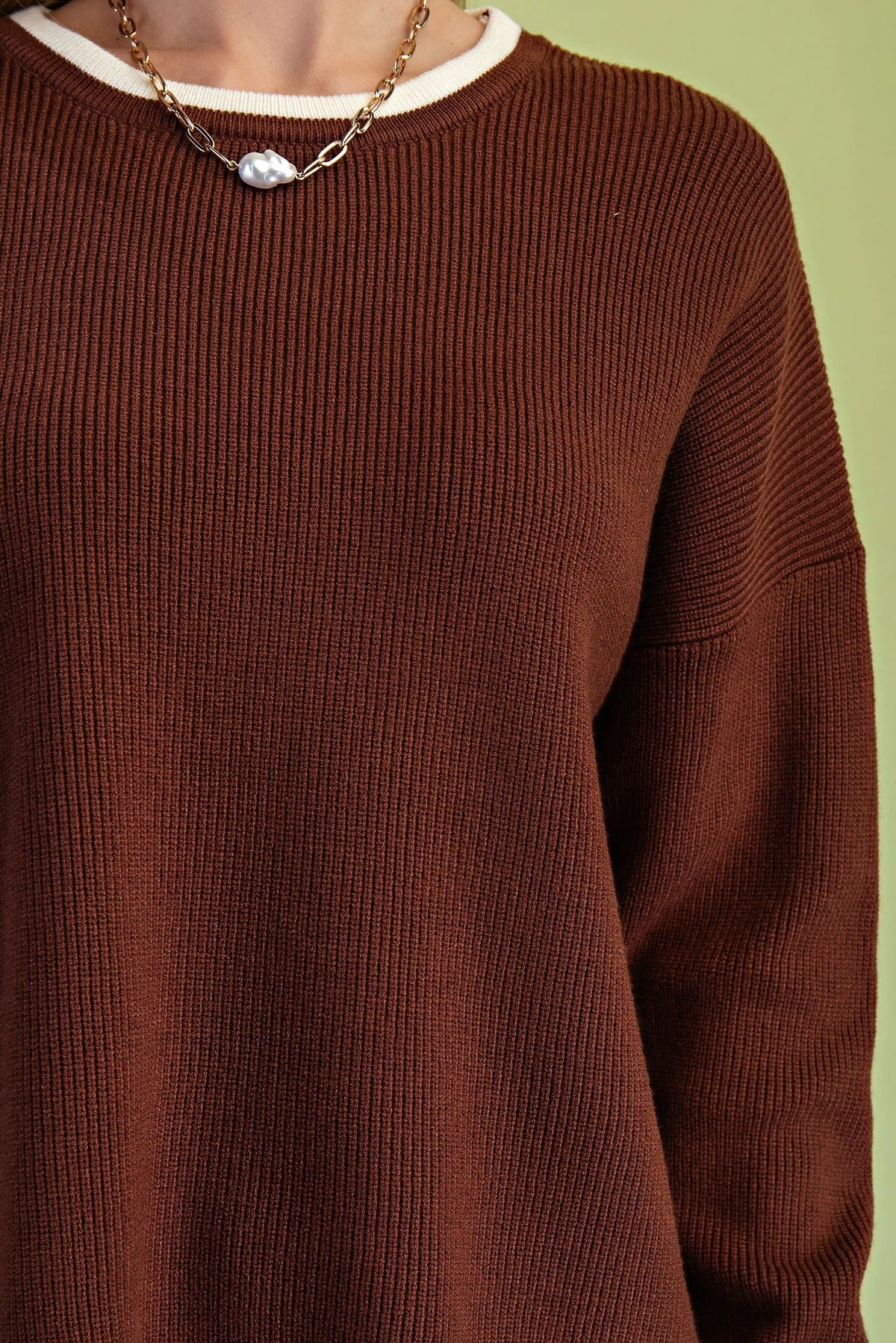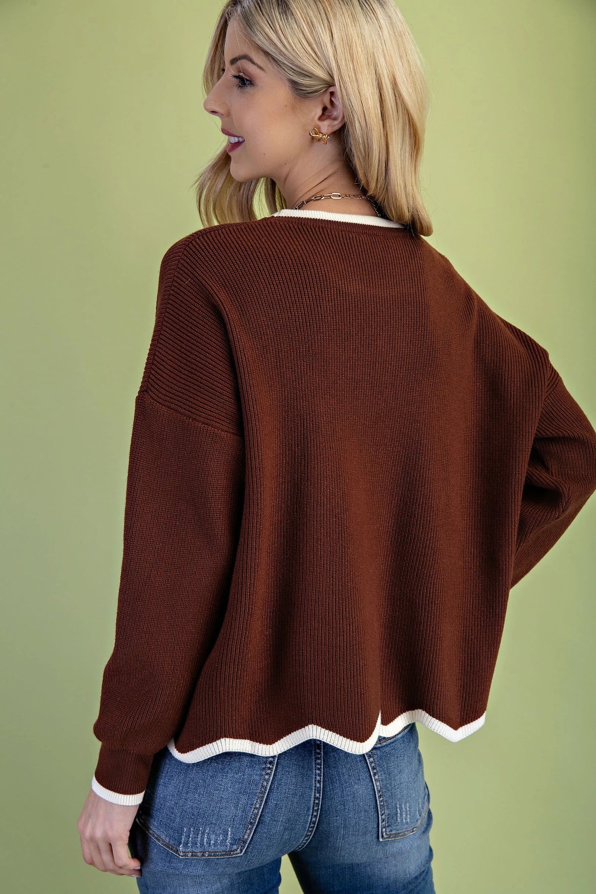 The Rustic Waves Contrast Knit brings effortless style and cozy comfort together in one perfect sweater. Crafted in a rich brown knit, this pullover features a soft, relaxed fit and beautifully contrasting ivory trim. The wavy hemline adds a unique, playful touch while giving the sweater a flattering silhouette. Lightweight yet warm, it’s the perfect everyday piece for fall, winter, and beyond—pair it with denim, leggings, or layered looks for instant chic.