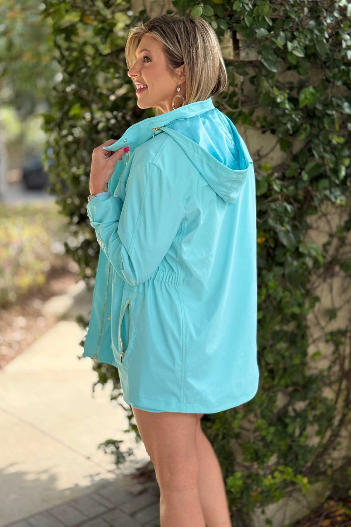 Whether you're traveling, running errands, or heading out for a breezy coastal walk, this stylish rain jacket combines practicality with boutique-worthy style.