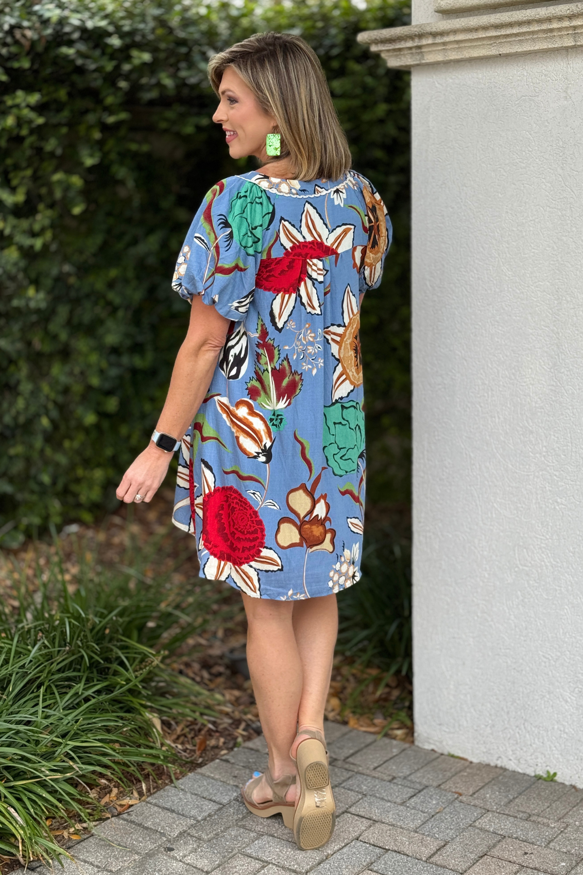 The Blue Garden Notch Neck Dress is effortless, feminine, and designed to stand out. This beautifully printed floral mini dress features a flattering notch neckline accented with decorative trim detailing for a polished finish. The short puff sleeves add soft structure while maintaining an easy, relaxed silhouette that moves beautifully with you. Fully lined in a lightweight denim blend, this dress offers comfort and coverage without feeling heavy. The swing-style shape makes it perfect for brunch, showers, vacation dinners, or casual events where you still want to feel put together. Pair it with wedges or sandals for a fresh, boutique-ready look that feels both playful and refined.