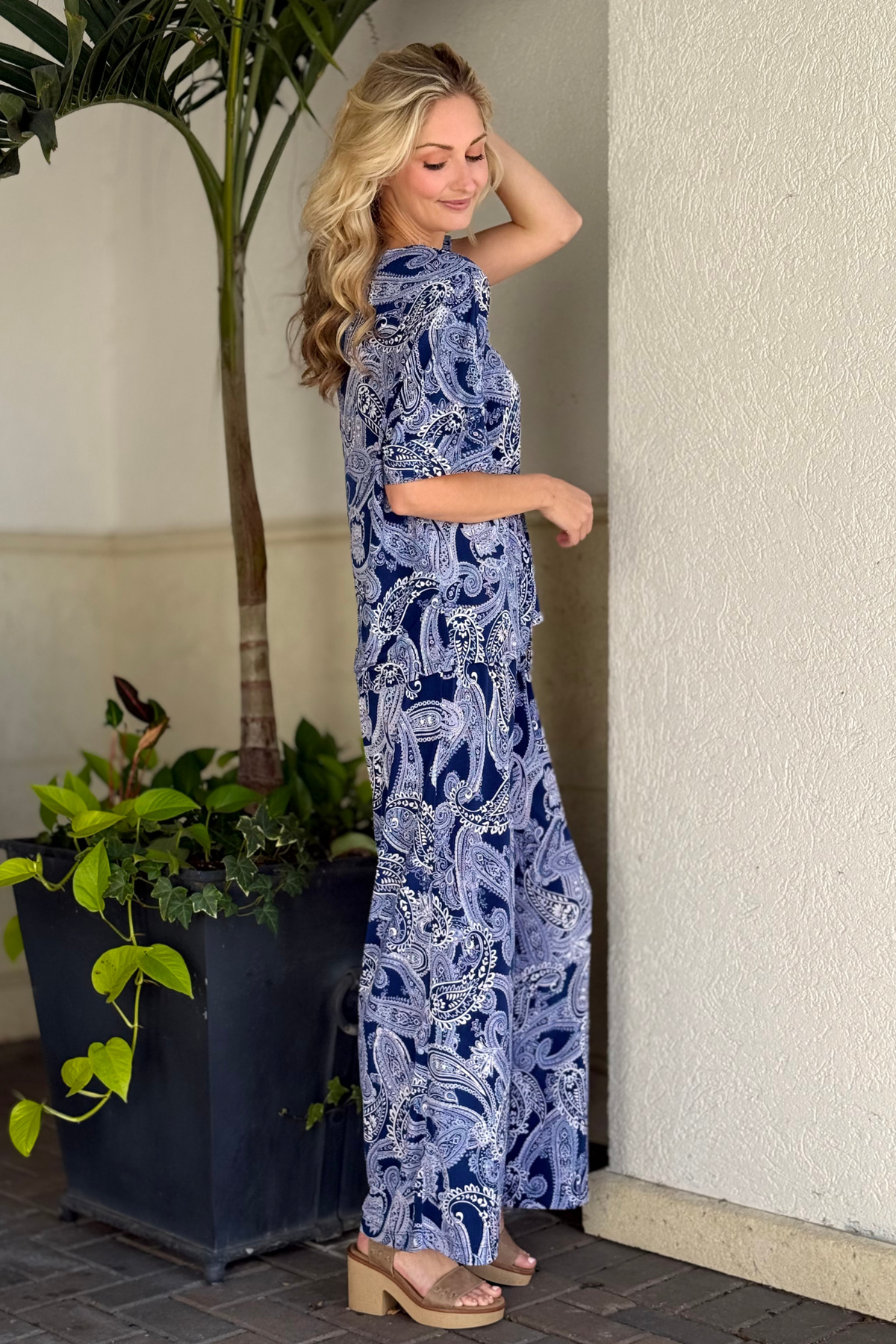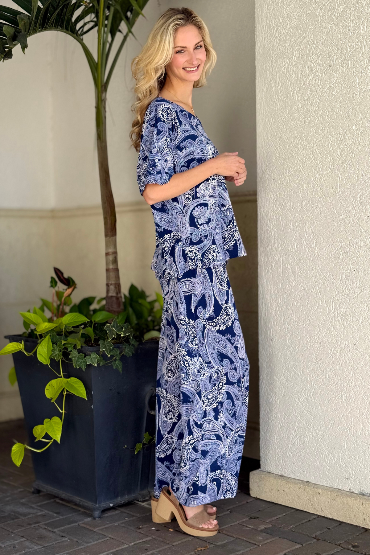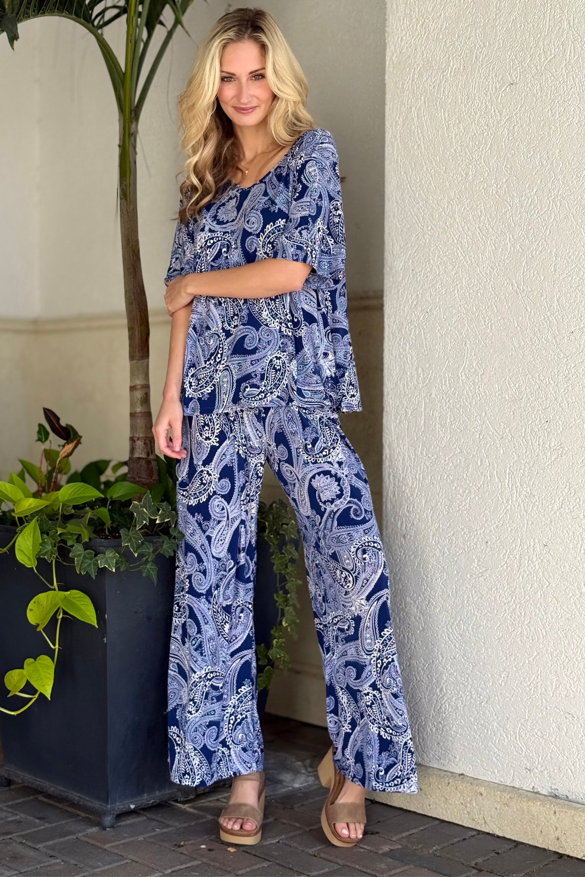lassic meets chic in The Cabana Lounge Set – Navy Paisley from our TPN Collection. Made from a soft, wrinkle-free fabric, this two-piece set features a relaxed V-neck dolman top and wide-leg pants designed with an elastic drawstring waist for effortless comfort. The navy paisley print gives this bestselling silhouette a timeless, elevated look—perfect for work-from-home days, travel, brunch, or everyday wear.