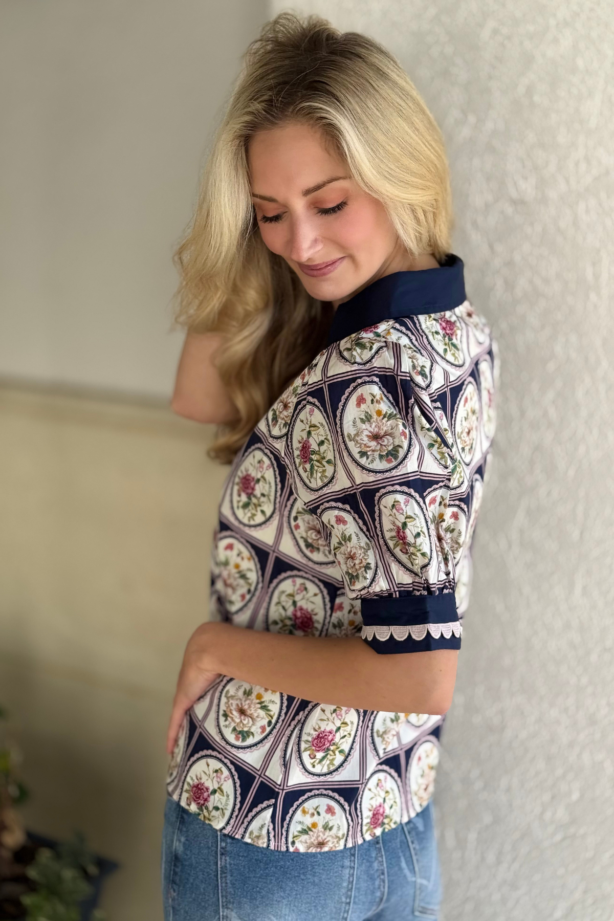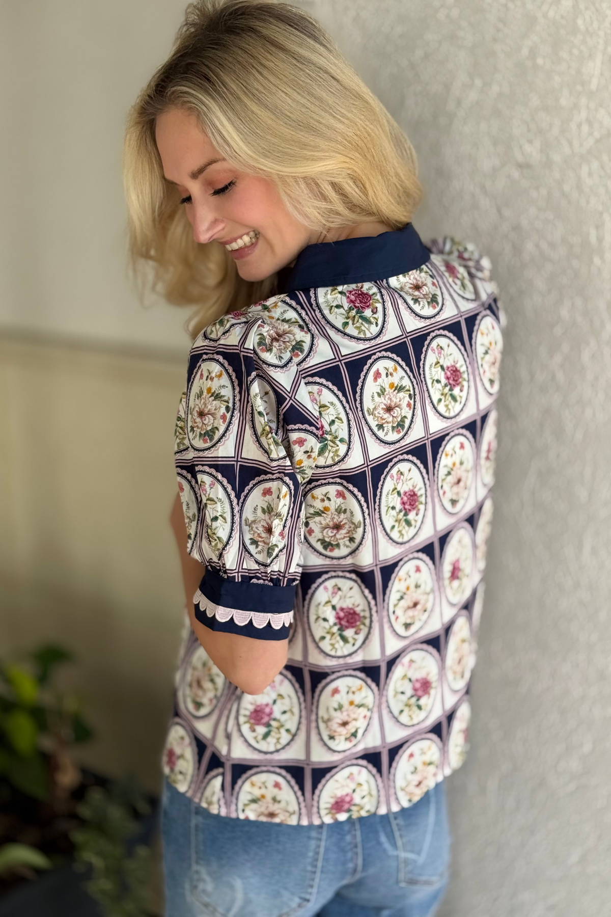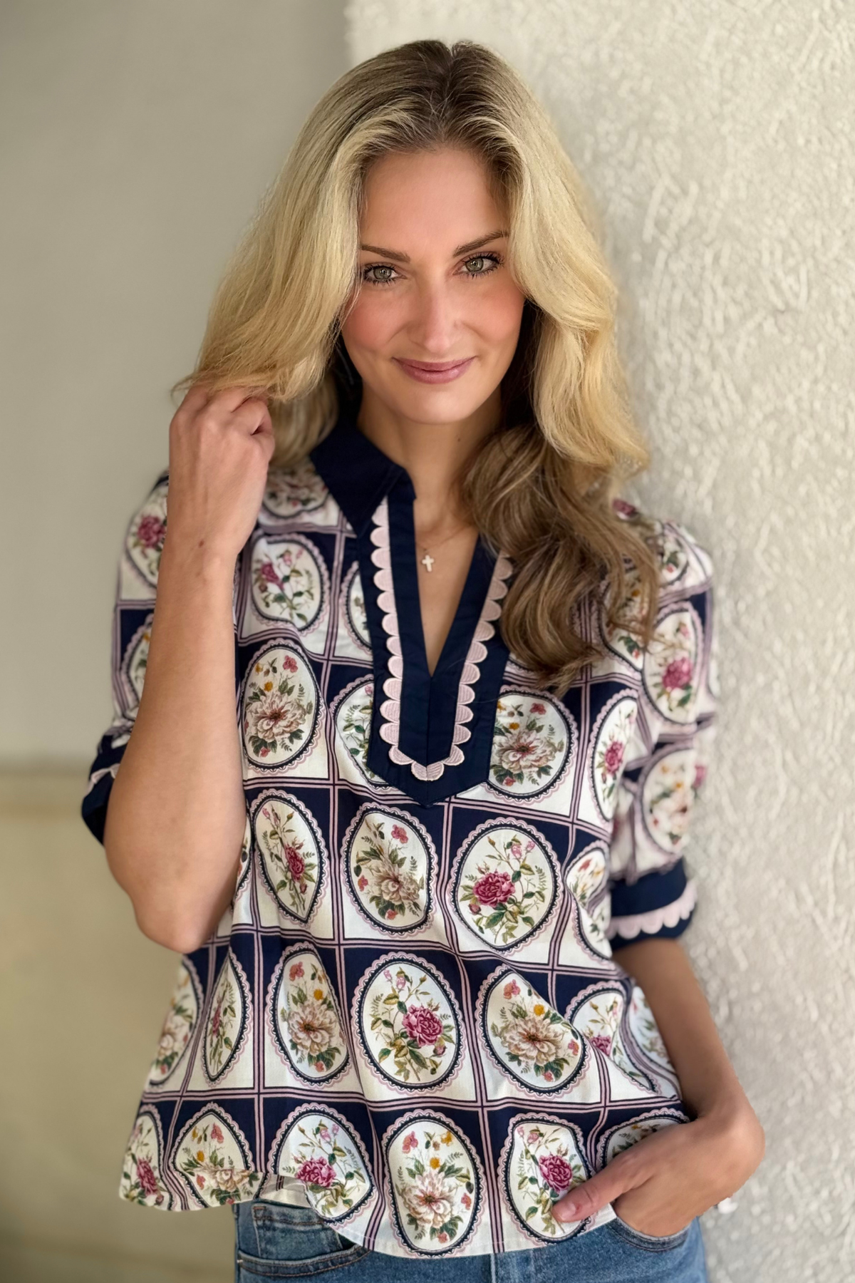 Elevate your everyday style with The Garden Estate Scallop Trim Top, a beautifully detailed piece that blends charm and sophistication. Designed with a collared V-neckline trimmed in contrast binding and delicate scallop accents, this top brings a refined, feminine touch to any look. The elbow-length puff sleeves add soft structure, while matching scallop-trim cuffs complete the polished finish. Fully lined and crafted in a relaxed fit, it’s comfortable, classic, and effortlessly timeless. Perfect for pairing with denim, tailored shorts, or crisp white bottoms.