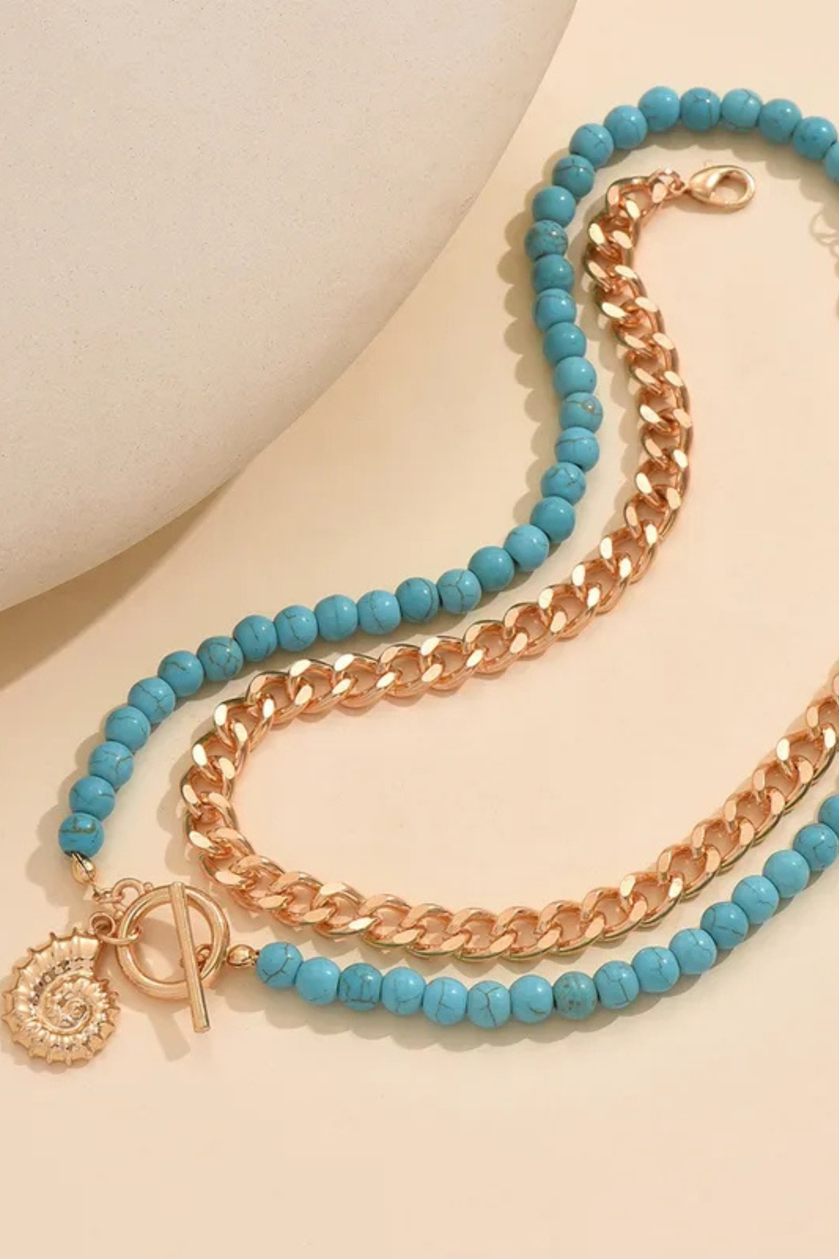 Designed as a layered look, this set creates instant dimension without the hassle of mixing and matching. The natural turquoise tones bring a fresh pop of color, while the gold beading adds warmth and sophistication. Finished with a stylish OT clasp, this necklace feels both timeless and on-trend.