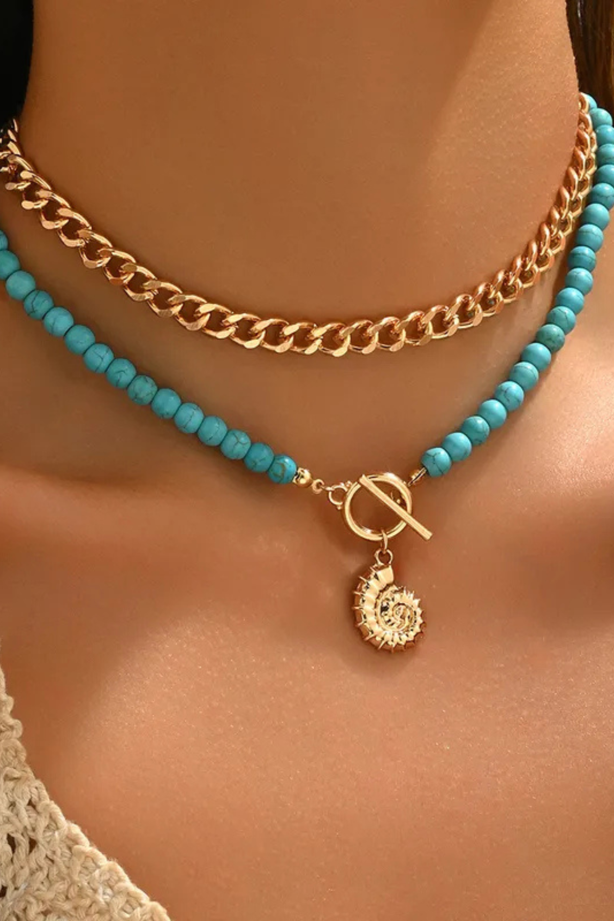 Channel effortless coastal elegance with The Golden Coast Turquoise Layered Necklace Set. This stunning two-piece design features vibrant turquoise beads paired with warm gold accents for the perfect blend of vintage charm and ocean-inspired style.