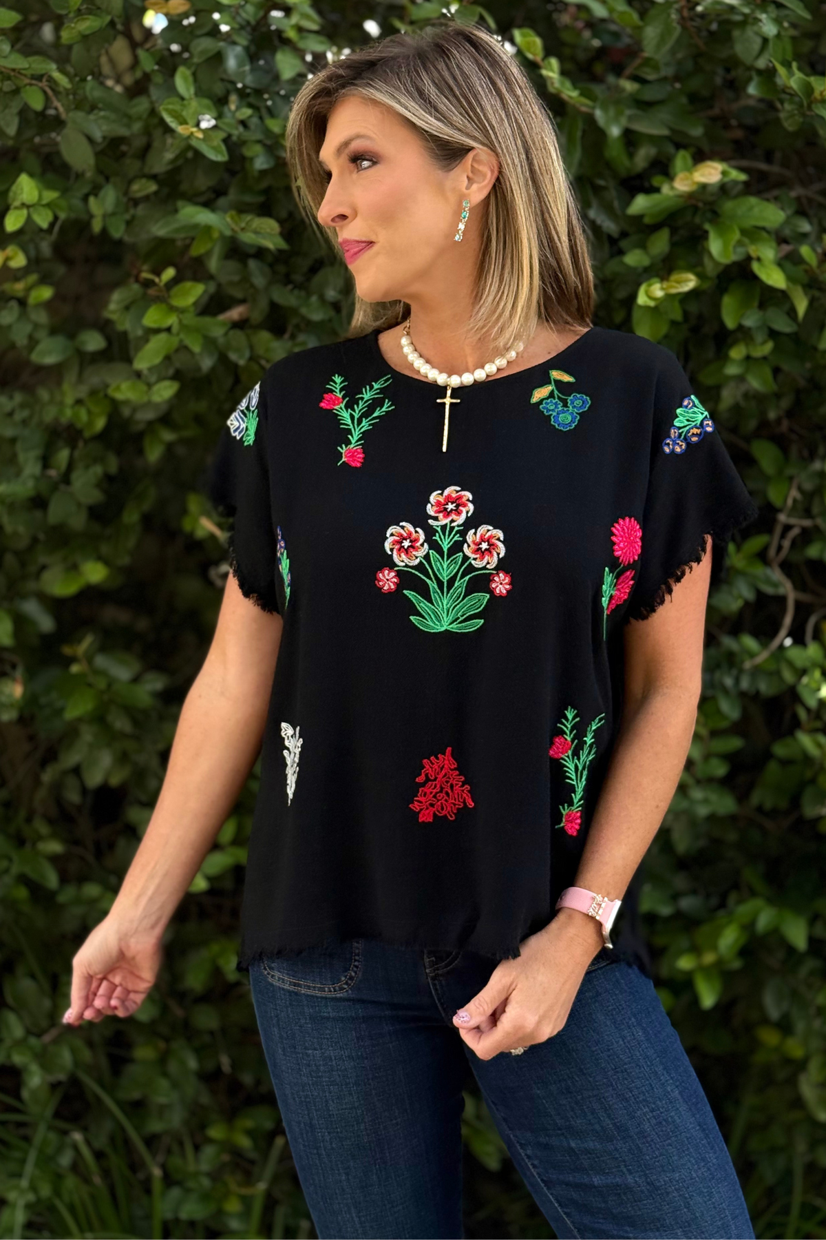 The Marbella Embroidered Linen Blend Top brings a touch of artisanal charm to your everyday look. Designed in a soft linen blend, this black top showcases colorful allover floral embroidery with a relaxed silhouette. The raw-edge sleeves and frayed hemline give it a laid-back, effortless vibe that pairs beautifully with jeans or white pants. Lightweight and unlined, it’s the perfect piece for casual days with standout style.