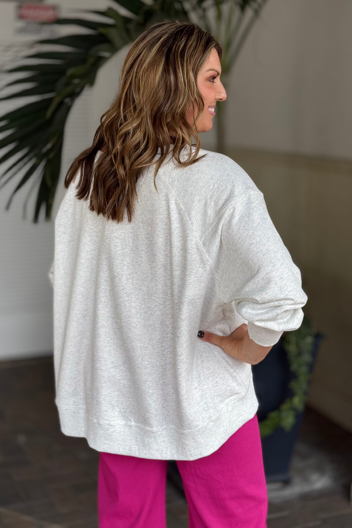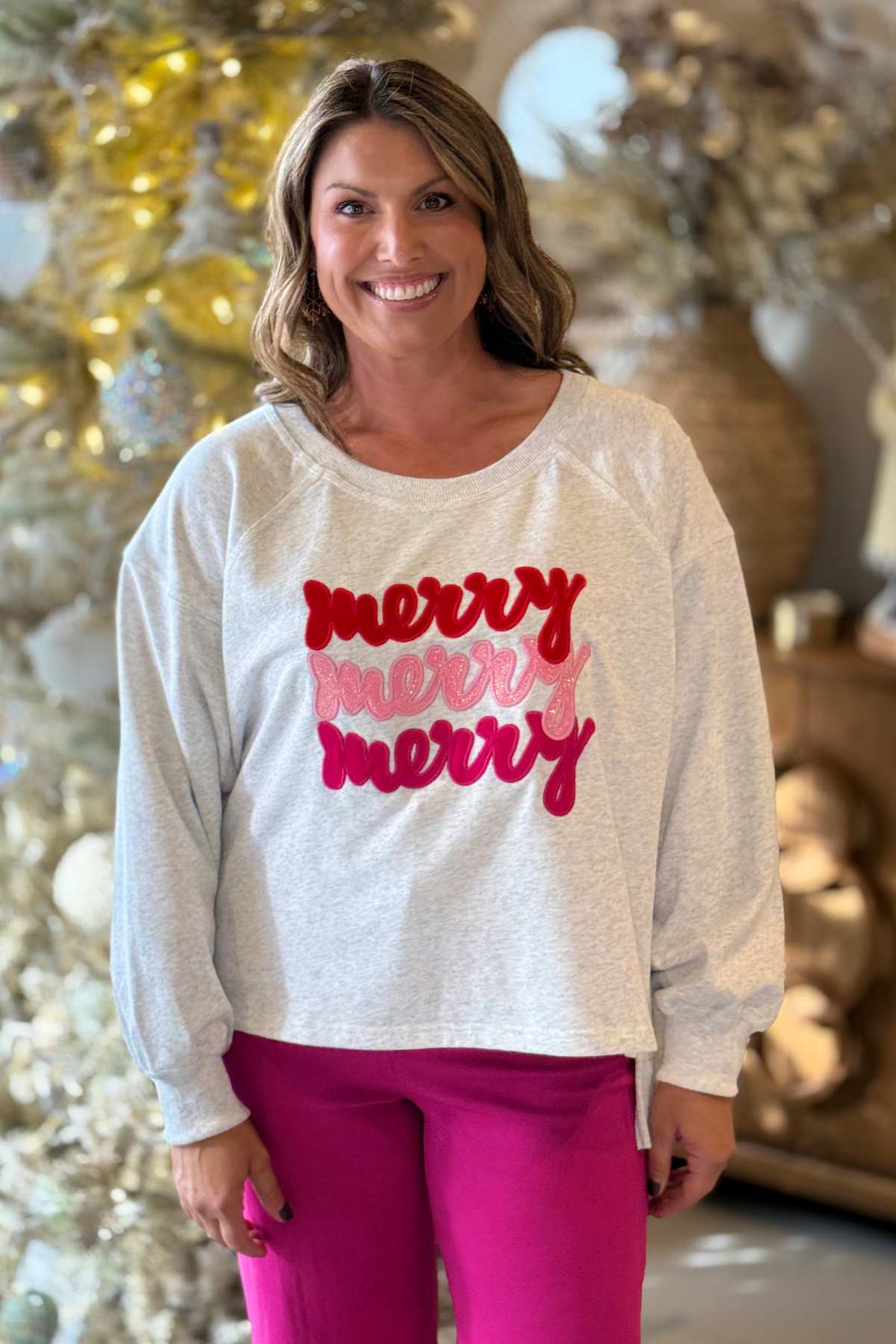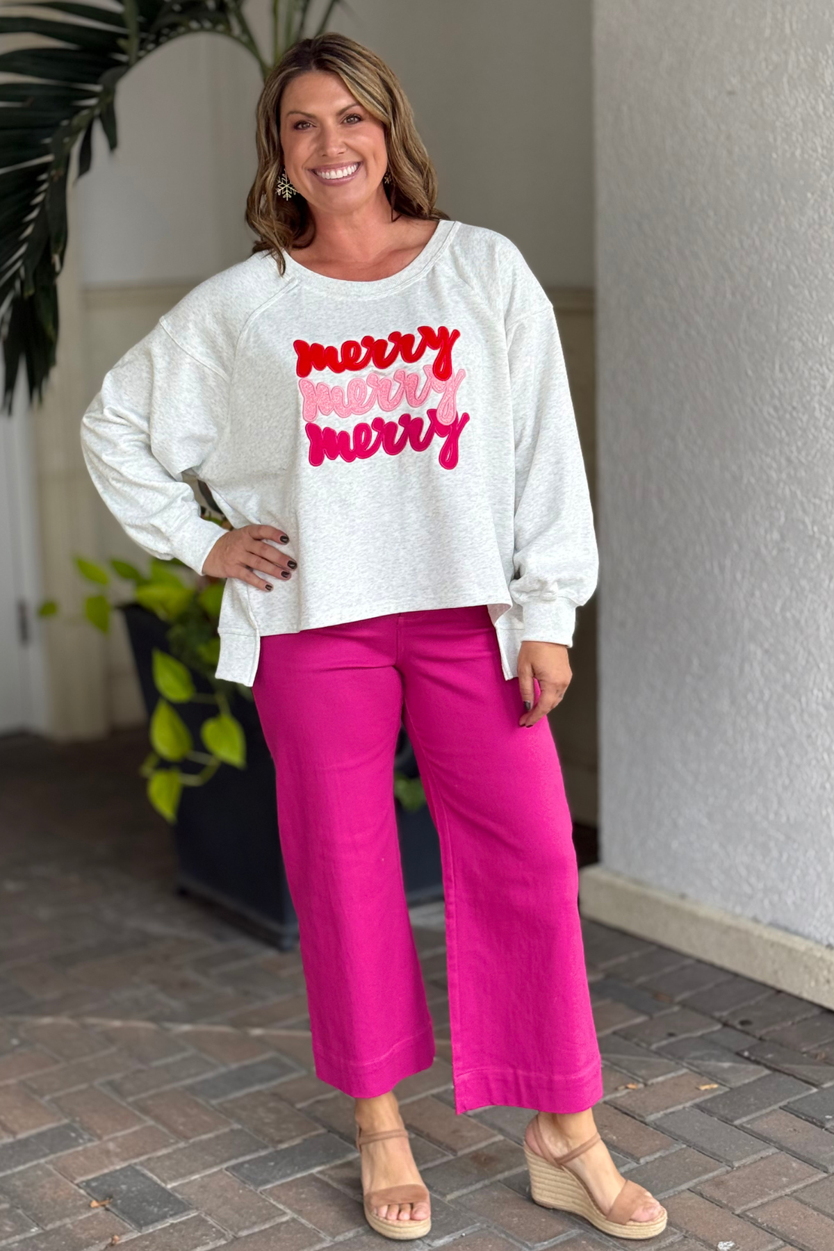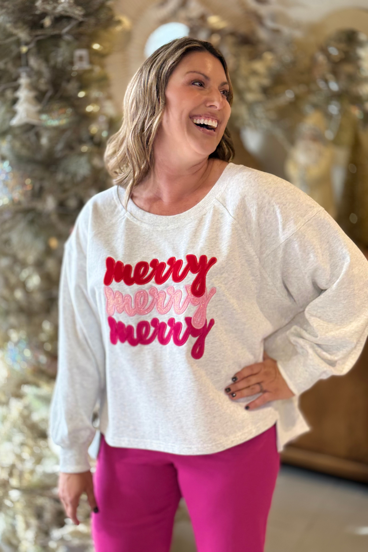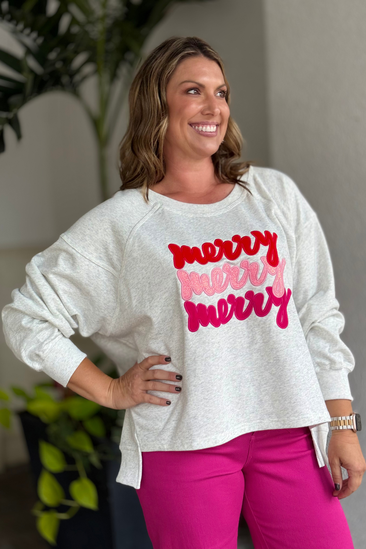 Bring on the holiday cheer in The Merry & Bright Sweatshirt! This festive pullover features soft, cozy fabric with a relaxed high-low hem, dropped shoulders, and a classic crew neckline. The bold triple “merry” embroidery pops in shades of red and pink, accented with a hint of glitter that adds just the right amount of sparkle. Perfect for holiday parties, cozy nights in, or festive errands, this sweatshirt pairs easily with jeans or bright trousers for an effortlessly merry look.