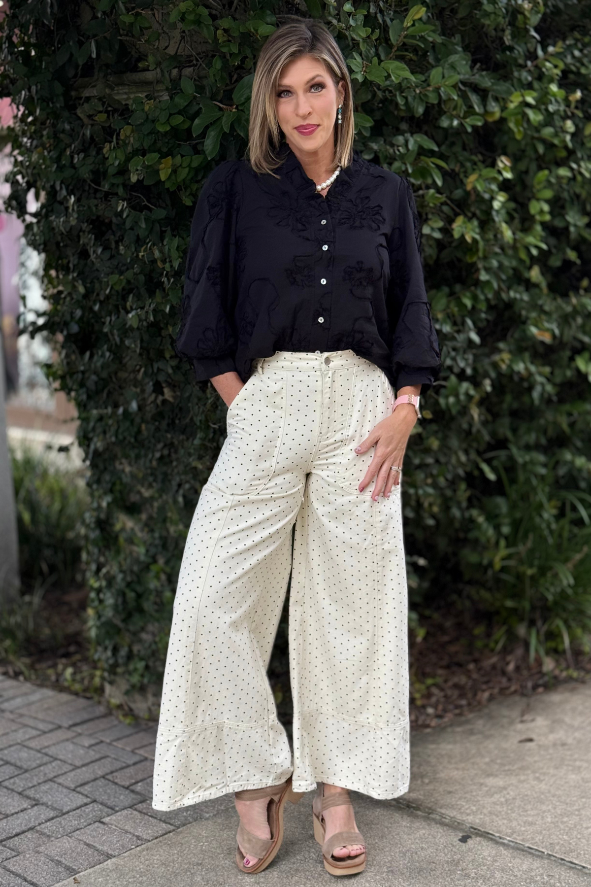 The Sorrento Polka Dot Wide Leg Pants bring effortless sophistication to your everyday style. Featuring a flattering high-rise fit, roomy front pockets, and a fluid wide-leg silhouette, these pants move with you in comfort and style. The soft ivory base with classic black polka dots adds a playful twist that’s perfect for pairing with tailored blouses, knits, or cropped jackets. Whether you’re dressing for brunch or the office, these versatile statement pants are a timeless addition to your wardrobe.