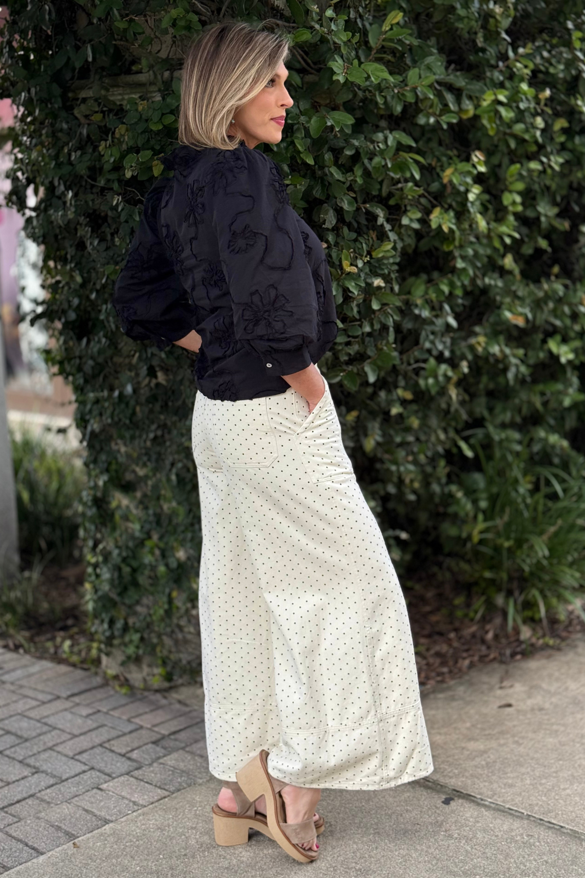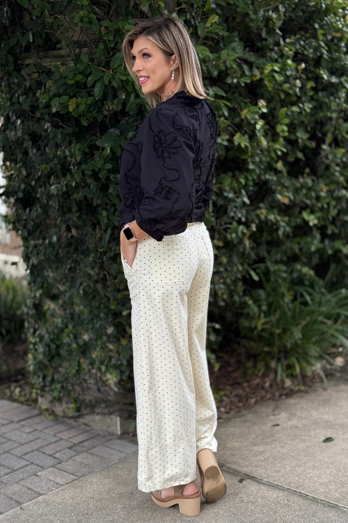 The Sorrento Polka Dot Wide Leg Pants bring effortless sophistication to your everyday style. Featuring a flattering high-rise fit, roomy front pockets, and a fluid wide-leg silhouette, these pants move with you in comfort and style. The soft ivory base with classic black polka dots adds a playful twist that’s perfect for pairing with tailored blouses, knits, or cropped jackets. Whether you’re dressing for brunch or the office, these versatile statement pants are a timeless addition to your wardrobe.