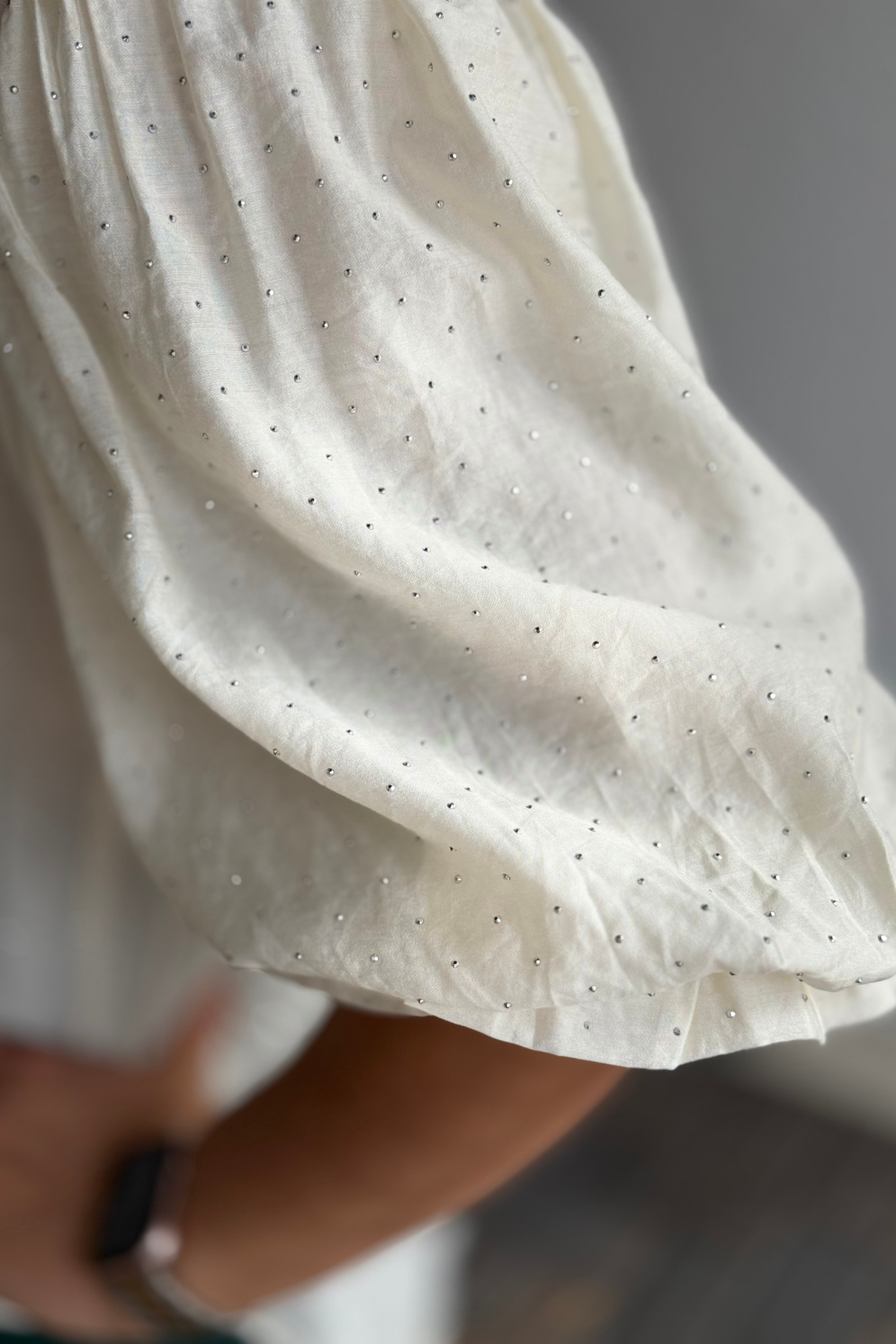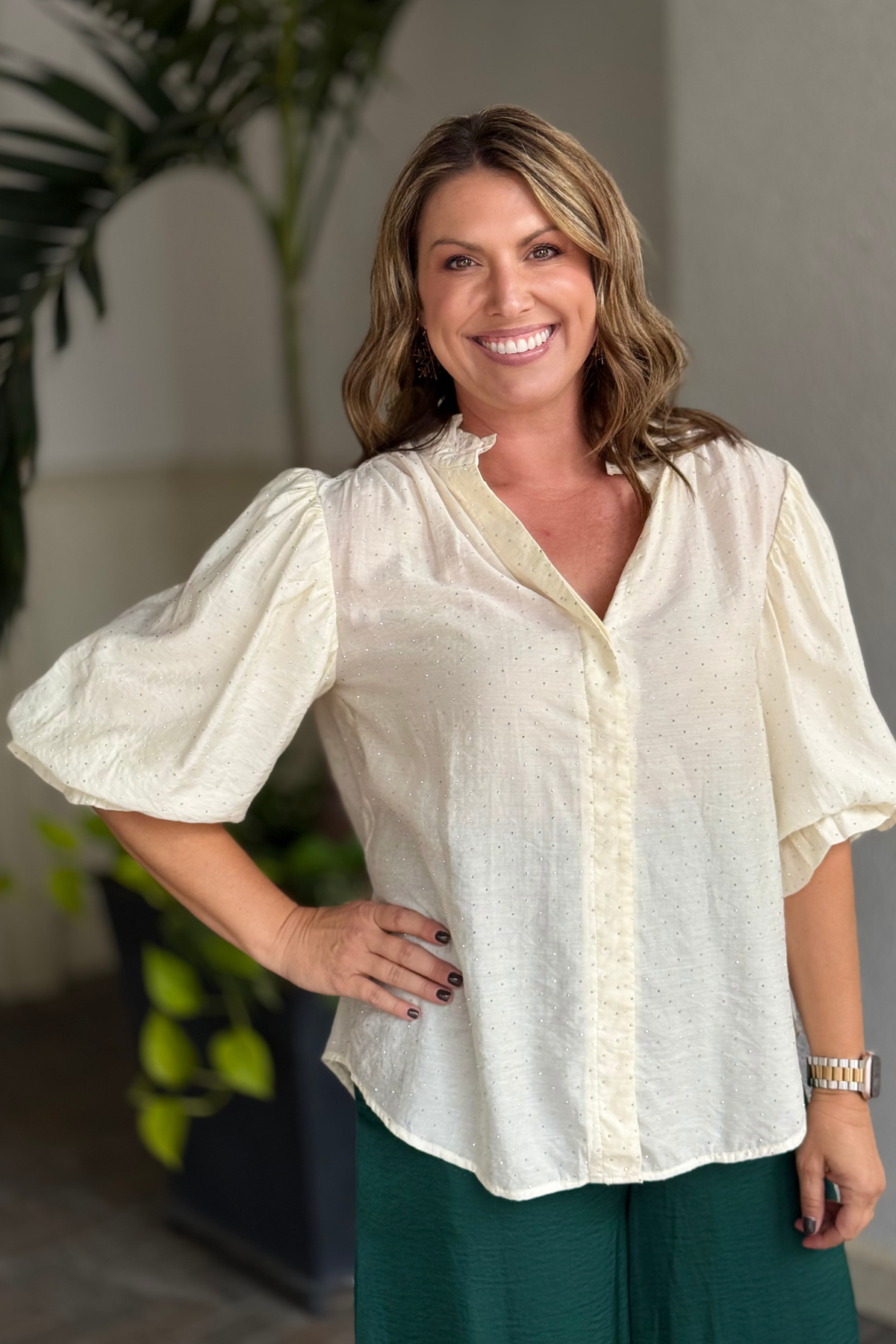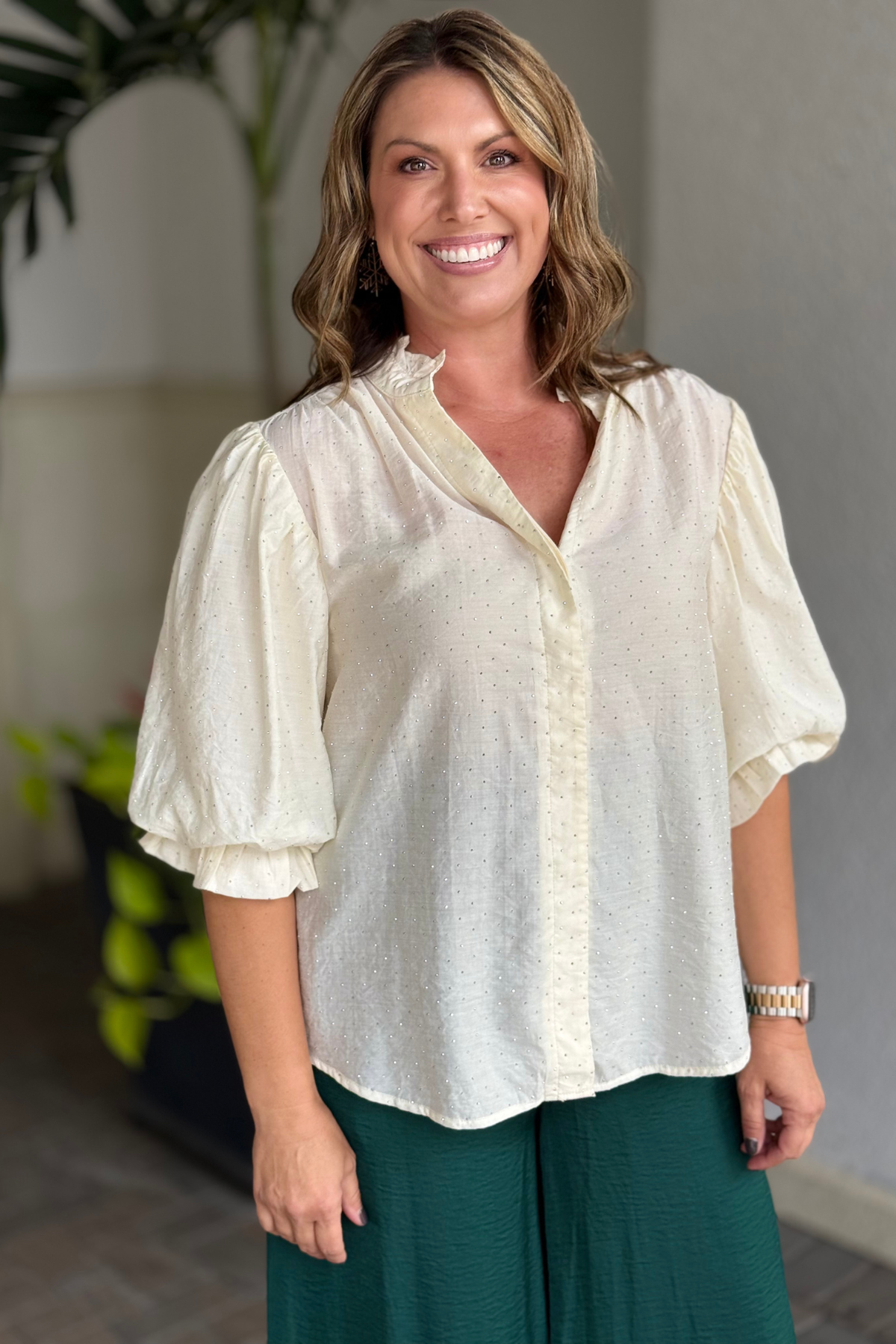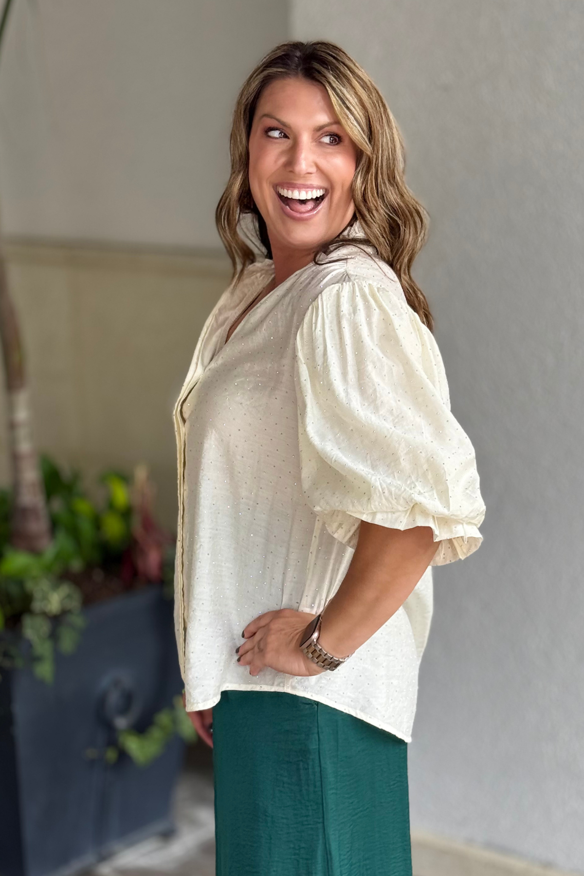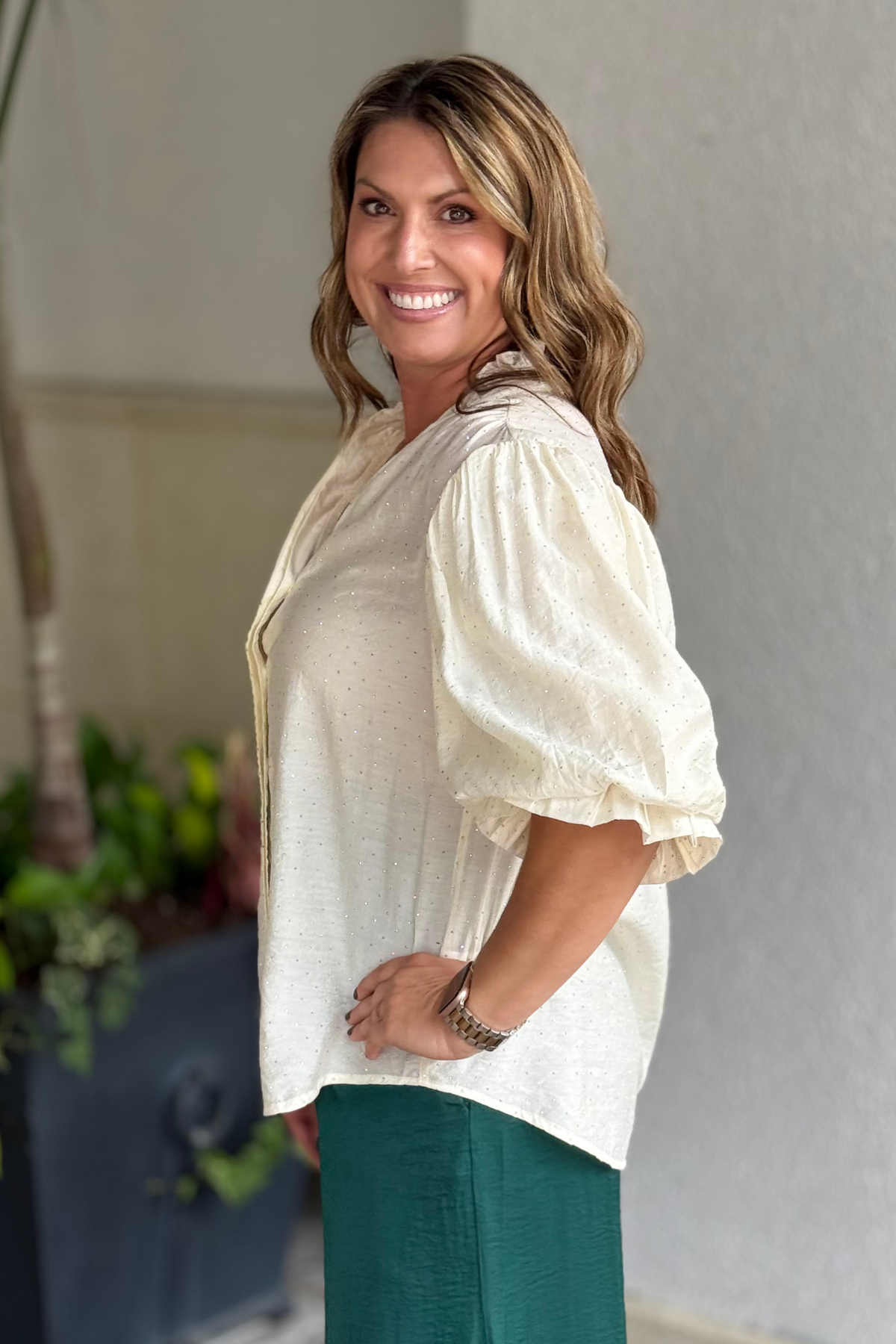 Elevate your look with The Starlit Sparkle Blouse, a chic statement piece that blends sophistication with subtle shine. Crafted in a soft cream hue, this blouse features delicate rhinestone embellishments that catch the light beautifully, giving just the right amount of shimmer. The ¾ length balloon sleeves add a romantic touch with gathered cuffs, while the relaxed fit drapes effortlessly for a polished yet comfortable silhouette. Perfect for holiday gatherings, date nights, or dressing up denim for an easy touch of elegance.