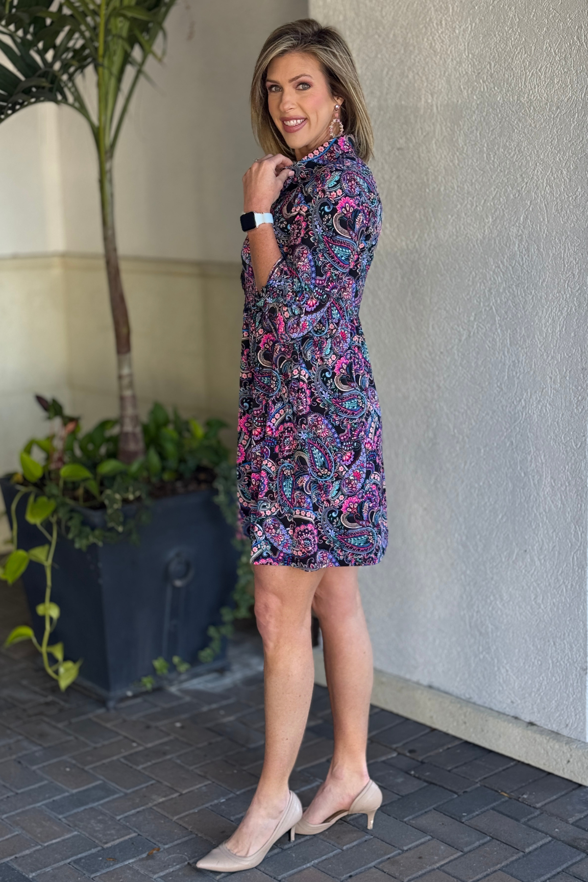 The Inspire Paisley Shirt Dress from Dear Scarlett is the definition of effortless style with everyday practicality. Designed with a flattering empire waist, this wrinkle-free shirt dress creates an easy, polished silhouette that moves with you throughout the day. The classic collar and button-front placket are accented with chic gold hardware, while the sleeve tab detail adds a refined, versatile touch. Finished with functional pockets and an eye-catching paisley print, this dress is perfect for busy mornings, Teacher Appreciation gifting, date nights, special occasions, or simply looking put together on the go. Comfortable, travel-friendly, and endlessly wearable, this is a dress you’ll reach for when life doesn’t slow down.