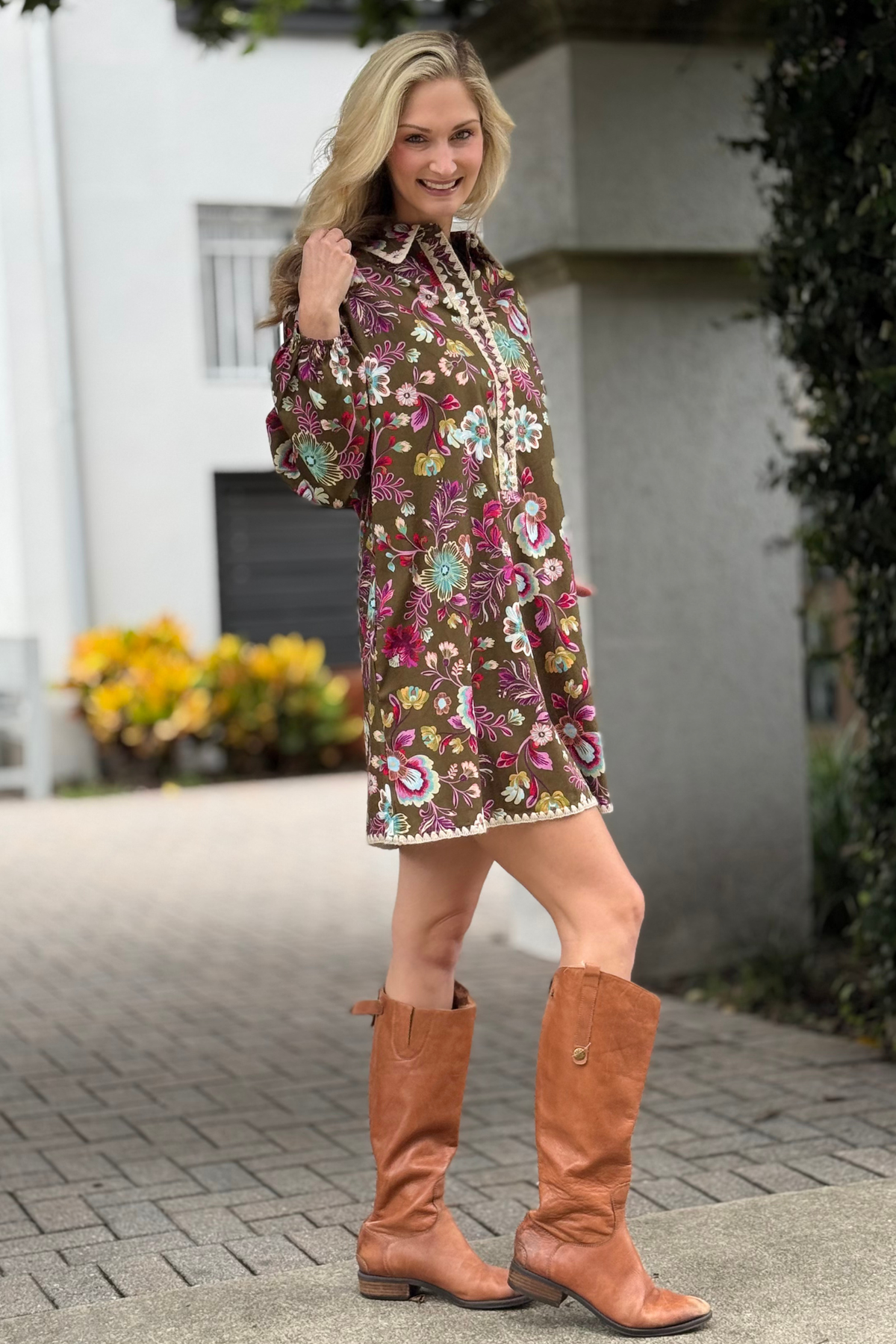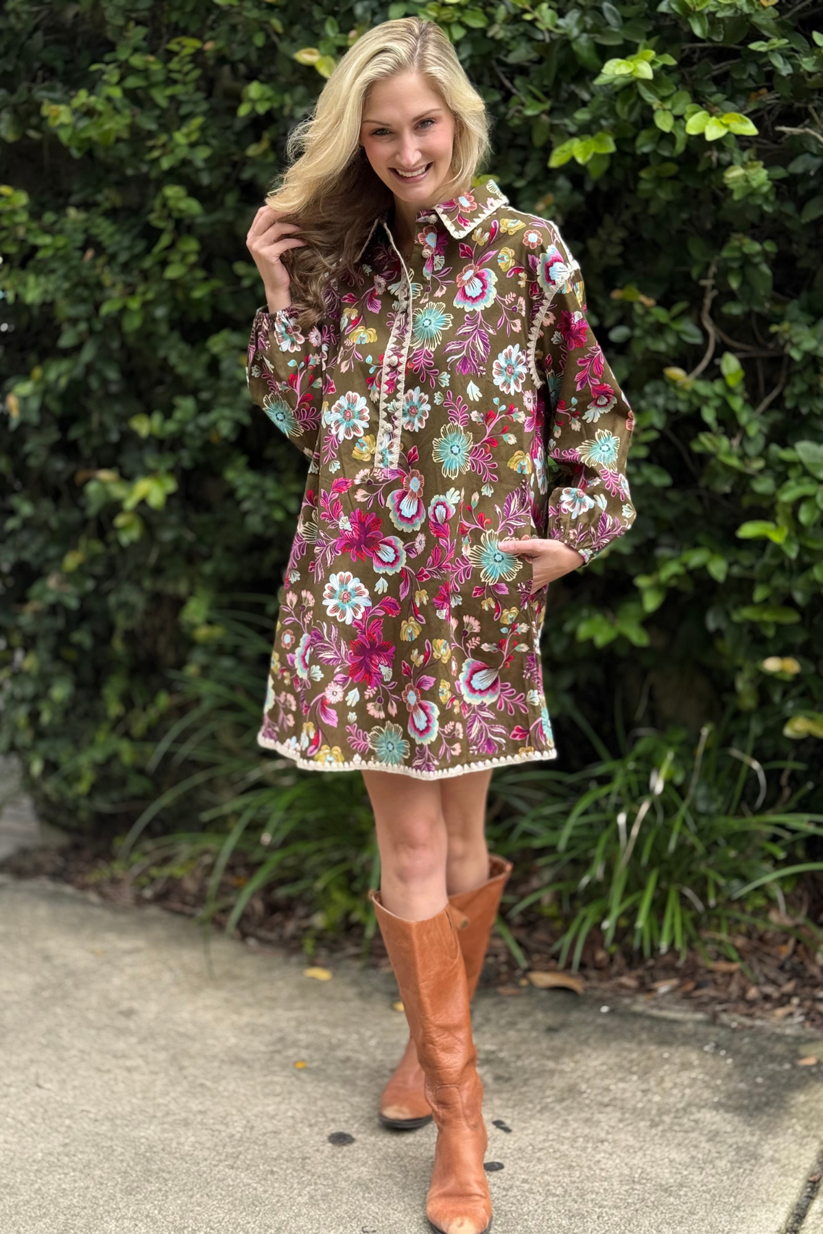 Step into effortless charm with our Wild Meadow Blanket Stitch Mini Dress — a statement piece that blends boho elegance with everyday ease. Featuring a rich floral print on an olive background, this dress pops with vibrant hues of pink, blue, and marigold. The collared neckline and half button-down placket are framed with contrast blanket triangle stitching for a handcrafted touch. Designed with long puff sleeves, convenient side pockets, and a fully lined interior, this flattering A-line silhouette is both stylish and comfortable. Pair it with your favorite boots for a chic fall look that transitions beautifully from day to night.